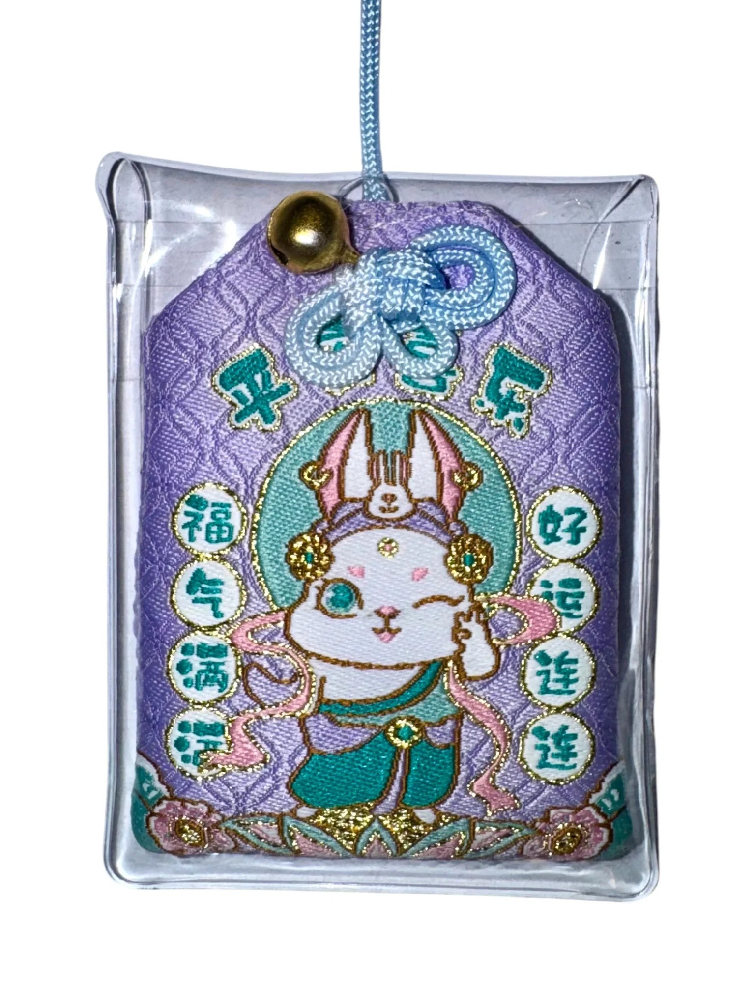 Sur le recto, Usagi est entouré de kanji porte-bonheur, tandis qu’au verso, l’inscription 平安喜乐 exprime un vœu de paix et de joie au quotidien.