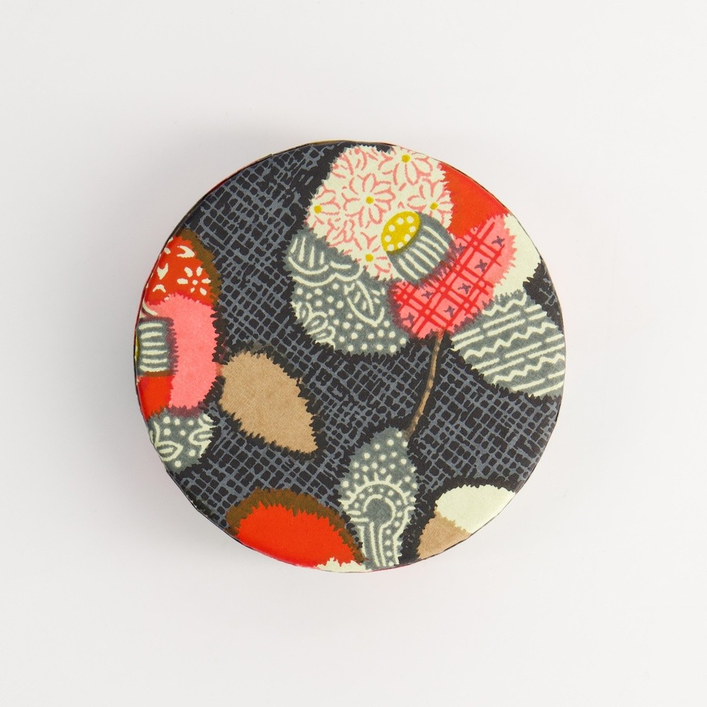 Cette boîte à thé japonaise en métal inoxydable est recouverte de papier washi traditionnel, avec un élégant motif patchwork rouge et bleu.