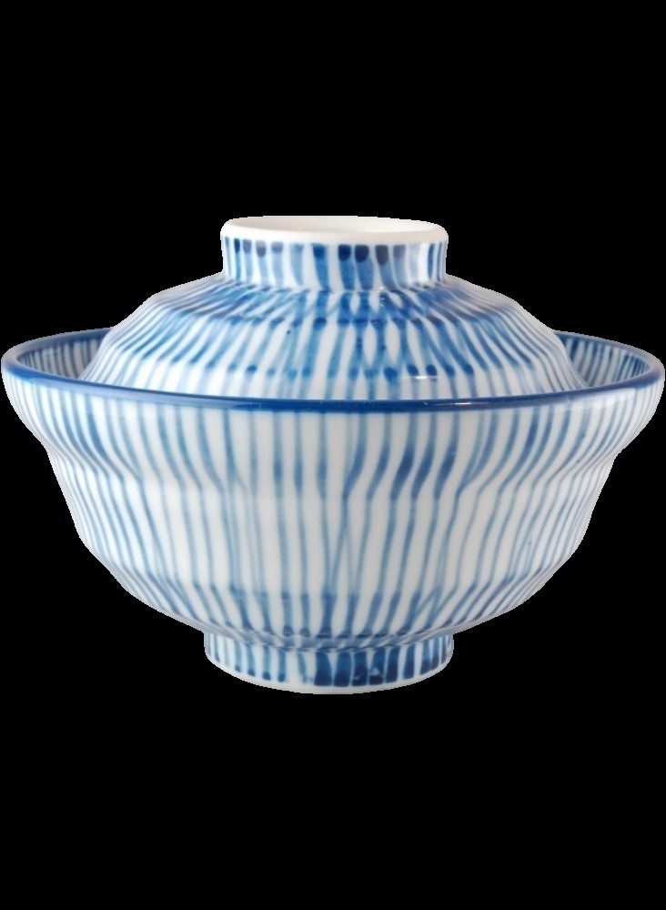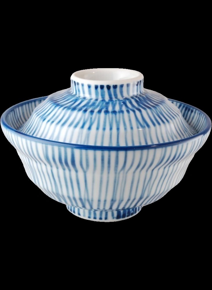 Modern and Past est heureux de vous présenter ce magnifique bol japonais avec couvercle Hakeme, une pièce traditionnelle de porcelaine bleu et blanc, fabriquée au Japon.