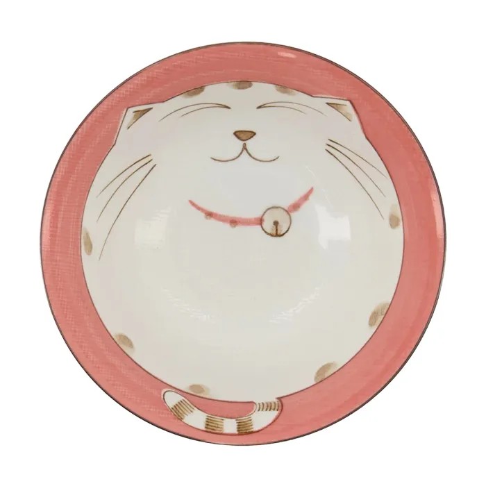 L’intérieur du bol présente un chat souriant, tandis que l’extérieur est décoré d’une queue de chat rose, créant un ensemble harmonieux et original.