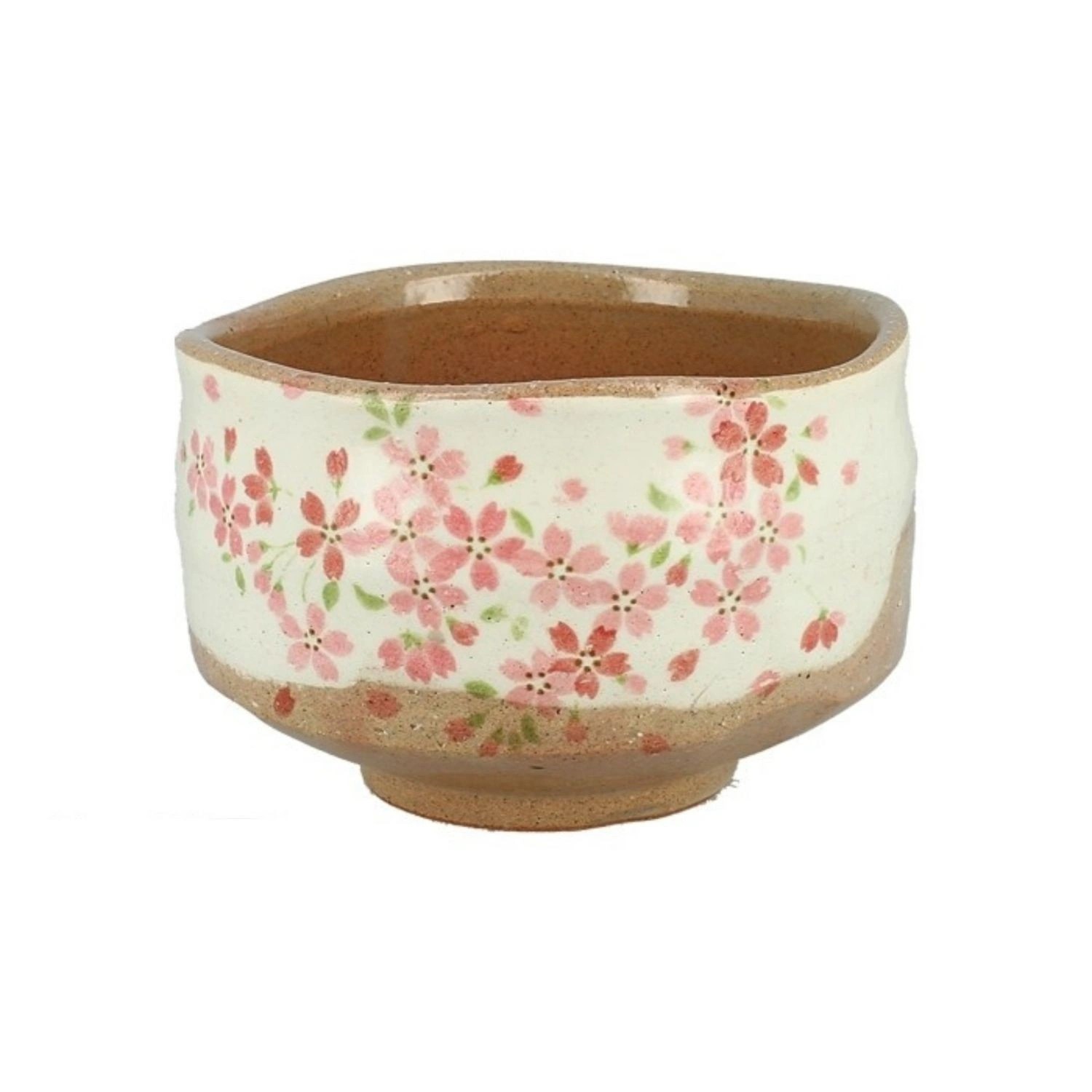 Ce bol artisanal, fabriqué au Japon, associe des tons beige et blanc à de délicats motifs floraux roses, symboles de renouveau et de sérénité.