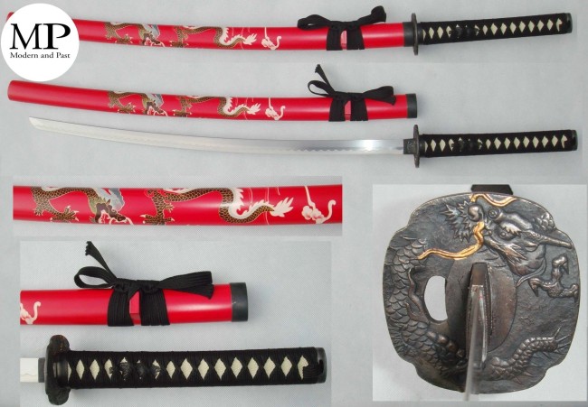 Katana de décoration japonais rouge – Motif Dragon – 105 cm