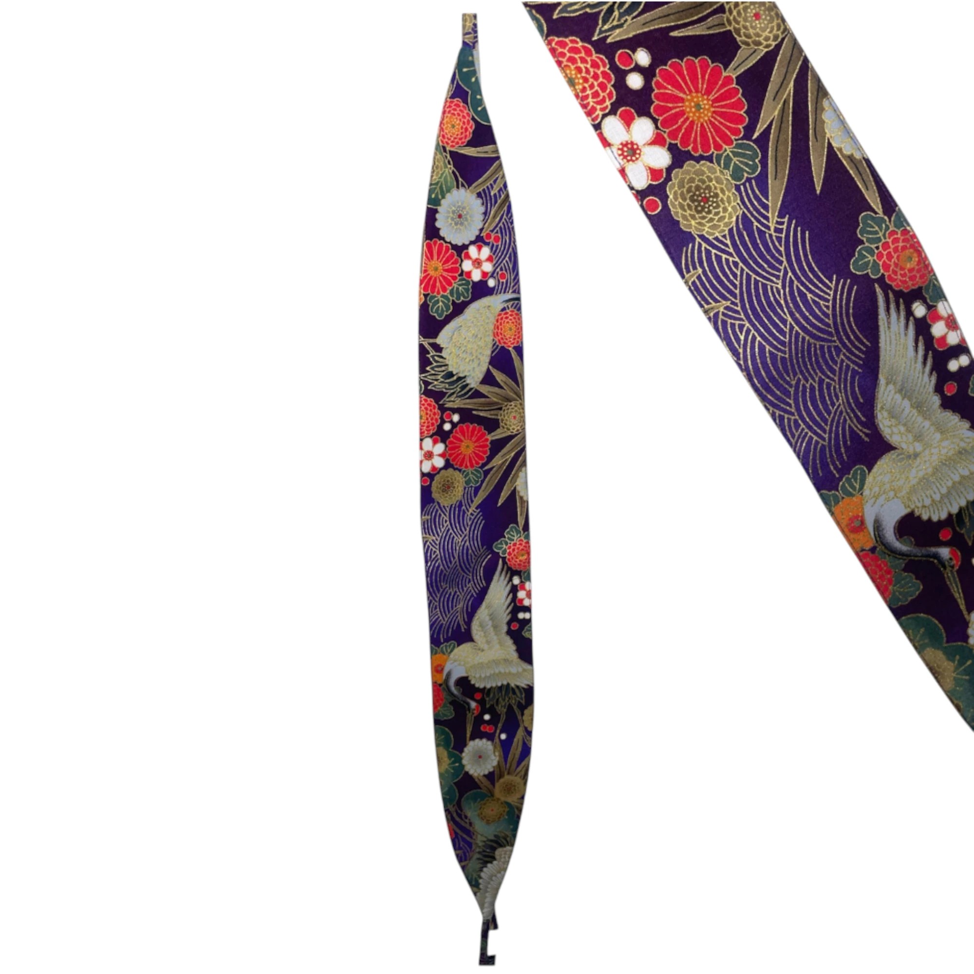 Cette ceinture obi japonaise mauve en coton séduit par ses motifs de grues et de fleurs, emblèmes de longévité, d’harmonie et de beauté dans la culture japonaise. Confectionnée en France à partir d’un tissu japonais de haute qualité, elle associe raffinement esthétique et savoir-faire artisanal.