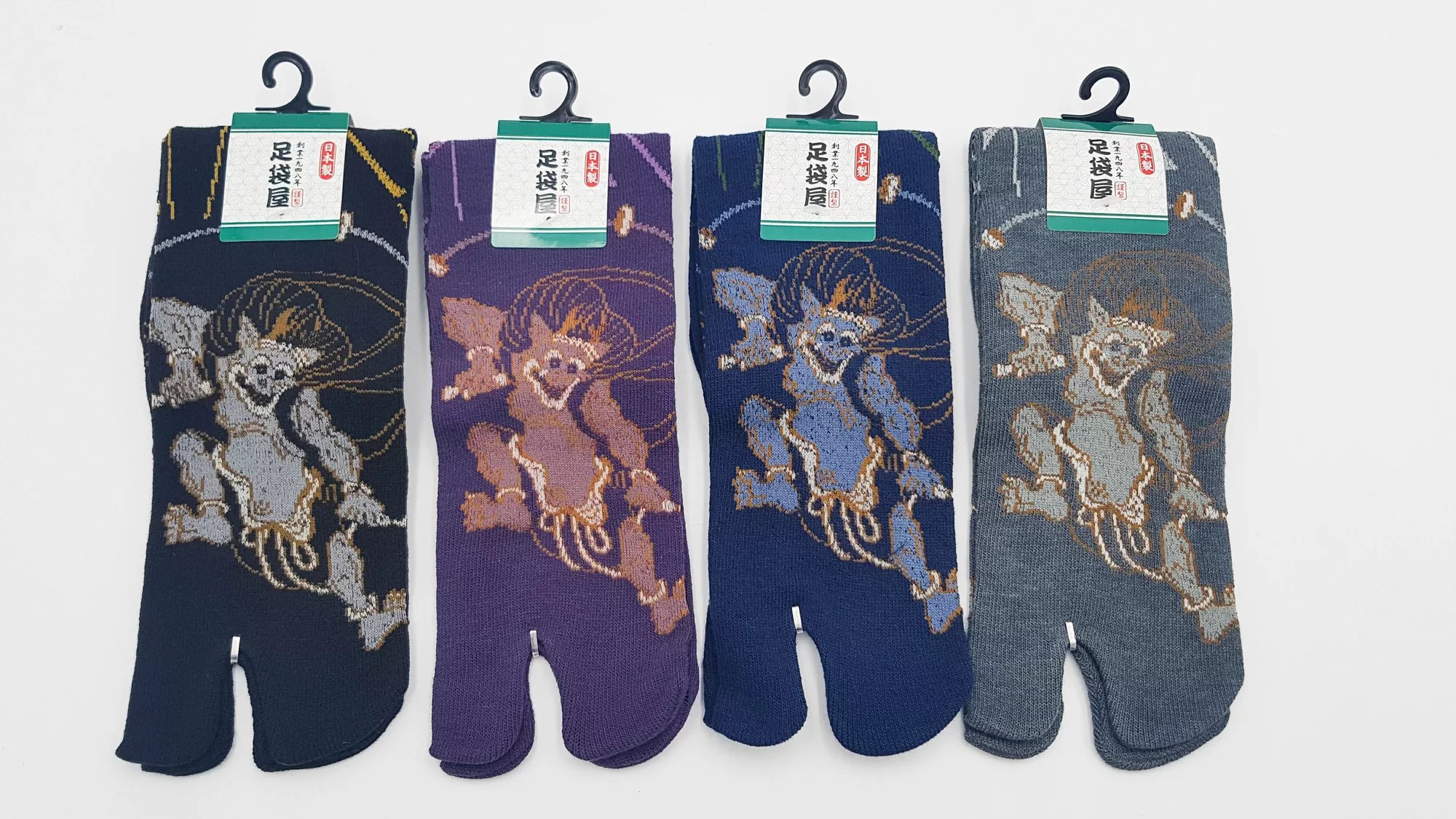 Modern and Past est heureux de vous présenter ces chaussettes japonaises Tabi, ornées du motif traditionnel du dieu du tonnerre Raijin.