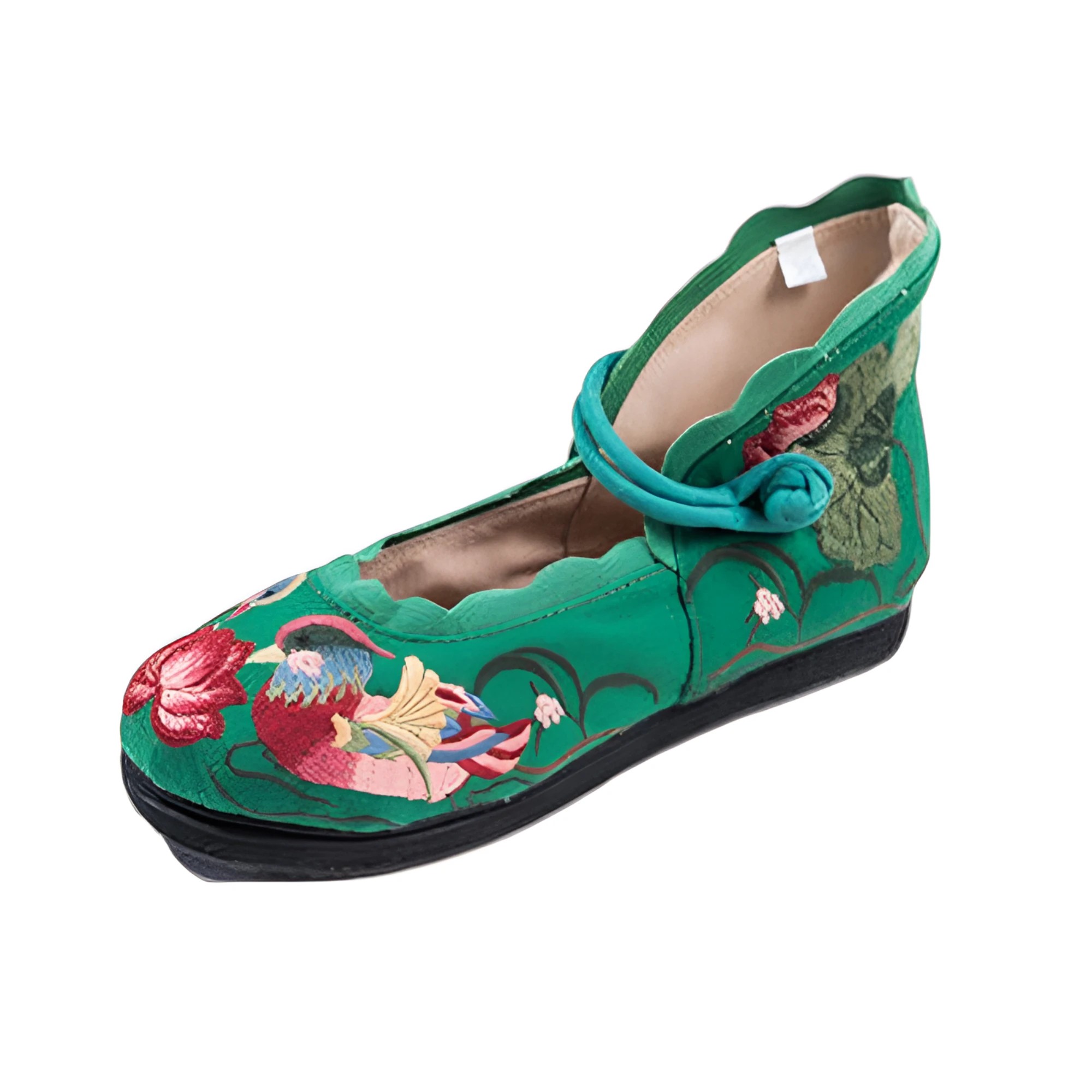 Ces chaussures asiatiques vertes en coton séduisent par leurs canards brodés aux détails délicats et leur esthétique inspirée de l’art textile asiatique. Élégantes et originales, elles apportent une touche zen et poétique à toutes vos tenues.
