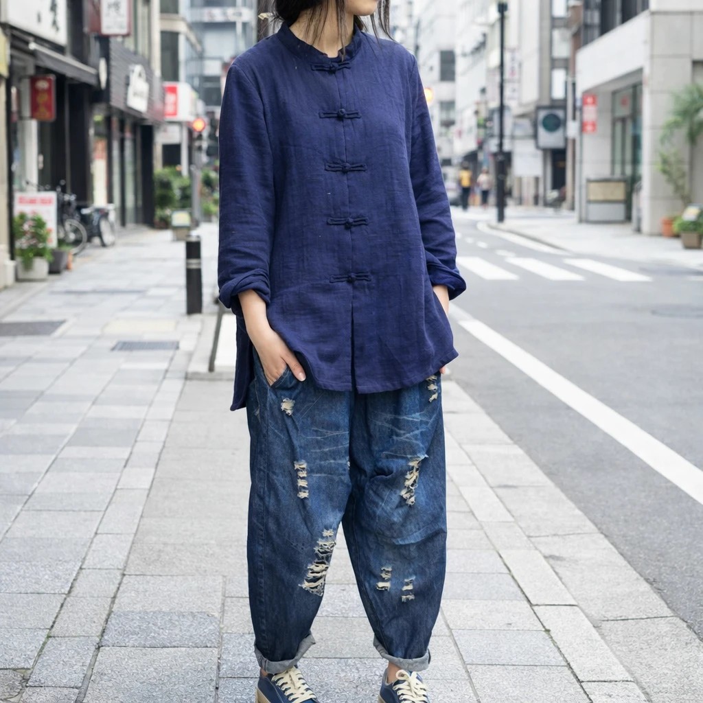 Modern and Past vous propose ce chemisier asiatique bleu marine, conçu en 100 % coton, à la fois doux, respirant et agréable à porter. Inspiré du vêtement traditionnel asiatique, il séduit par sa coupe simple et son boutonnage asiatique authentique.