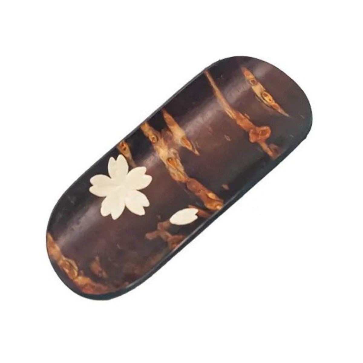 Réalisée en bois de cerisier de montagne, elle séduit par sa chaleur naturelle, sa texture lisse et sa subtile incrustation en forme de fleur de cerisier Sakura.