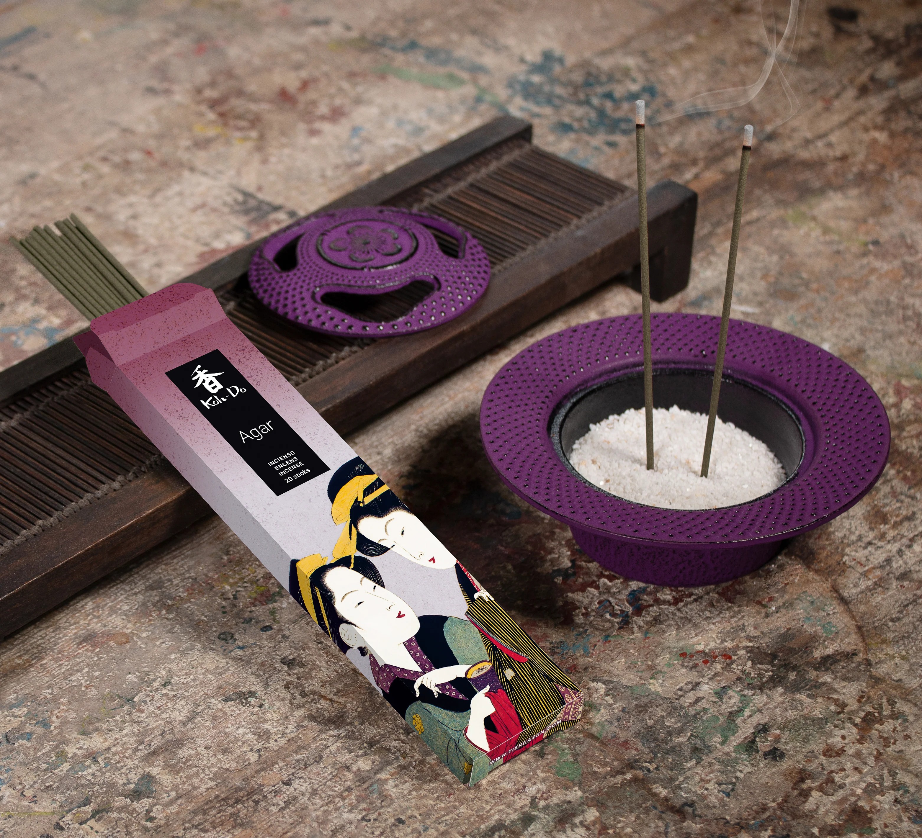 L’encens japonais Koh Do Agar est élaboré à partir du bois d’agar, également connu sous le nom d’oud, jinkoh ou kyara. Ce bois précieux se forme lentement, en silence, au contact de la terre, développant une senteur mystérieuse, profonde et spirituelle. Dans la tradition japonaise, le bois d’agar est au cœur du Koh-do, la Voie de l’Encens, un art raffiné dédié à l’écoute et à l’appréciation des parfums. Le design de la boîte, inspiré d’une gravure ukiyo-e de Chōki, évoque cet univers de concentration, de culture et de pleine conscience.