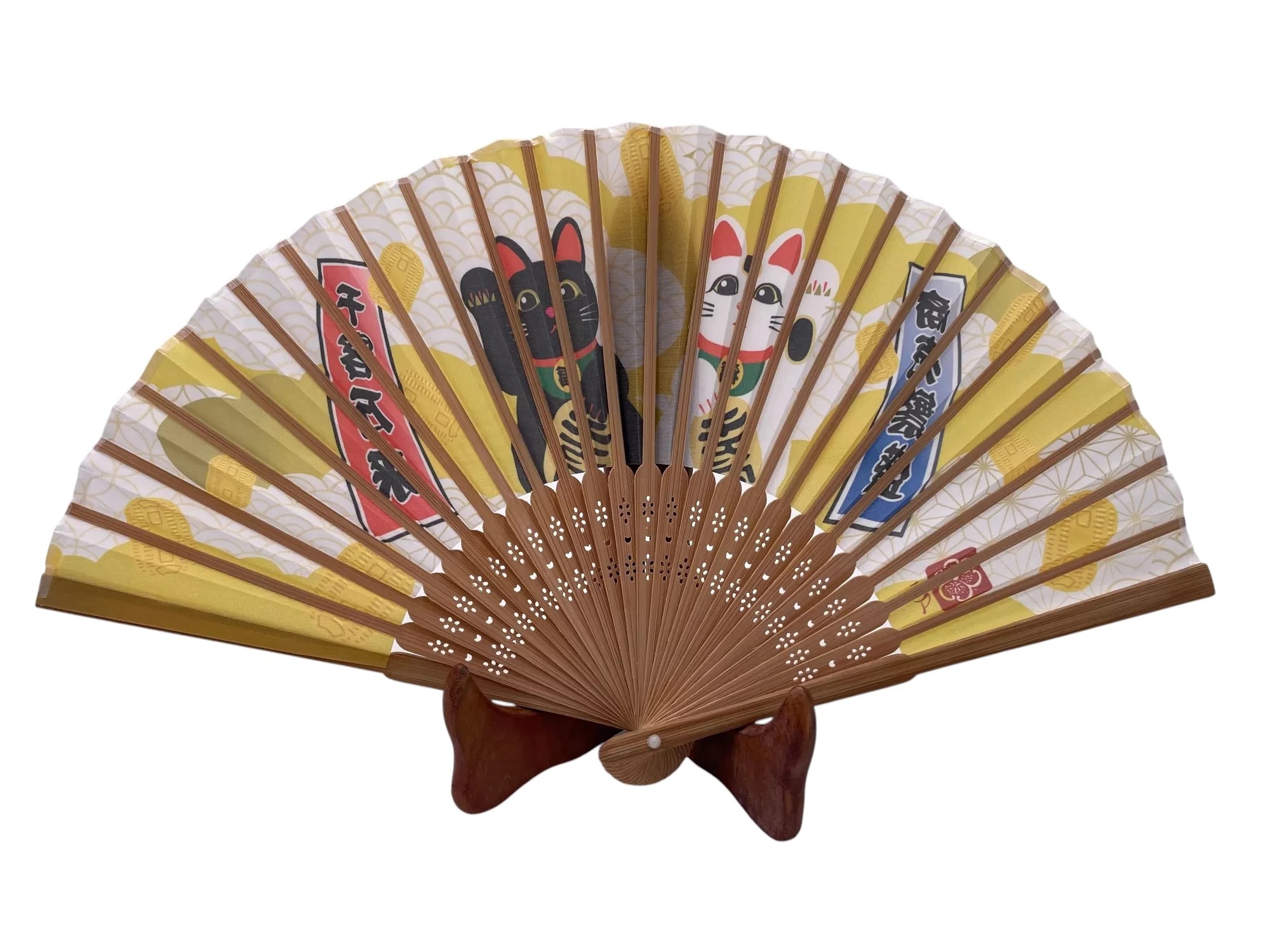 Fabriqué en papier et bambou, cet éventail de 21 cm est à la fois léger, pliable et facile à transporter. Ses tons dorés et ses deux Maneki Neko – l’un blanc et l’autre noir – évoquent la richesse, la chance et l’harmonie. Parfait pour les festivals d’été, la décoration intérieure ou pour offrir un cadeau symbolique à un proche.
