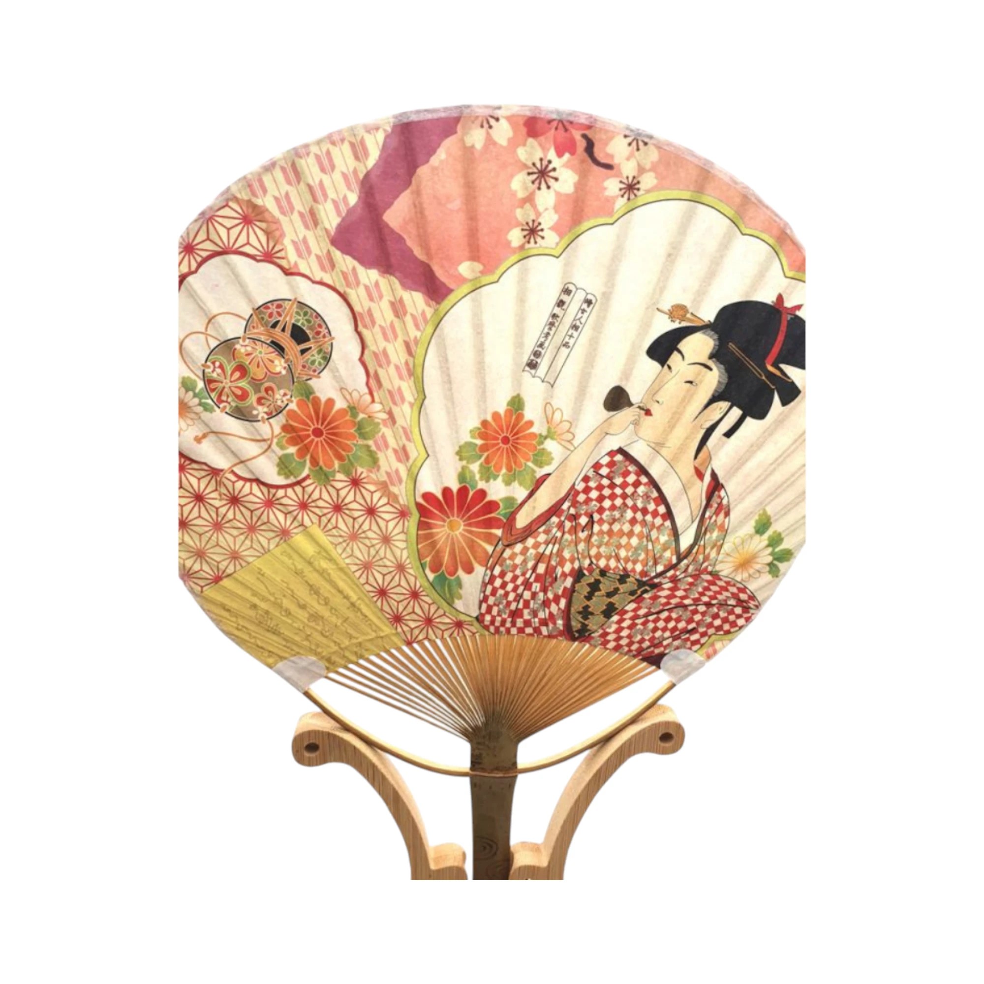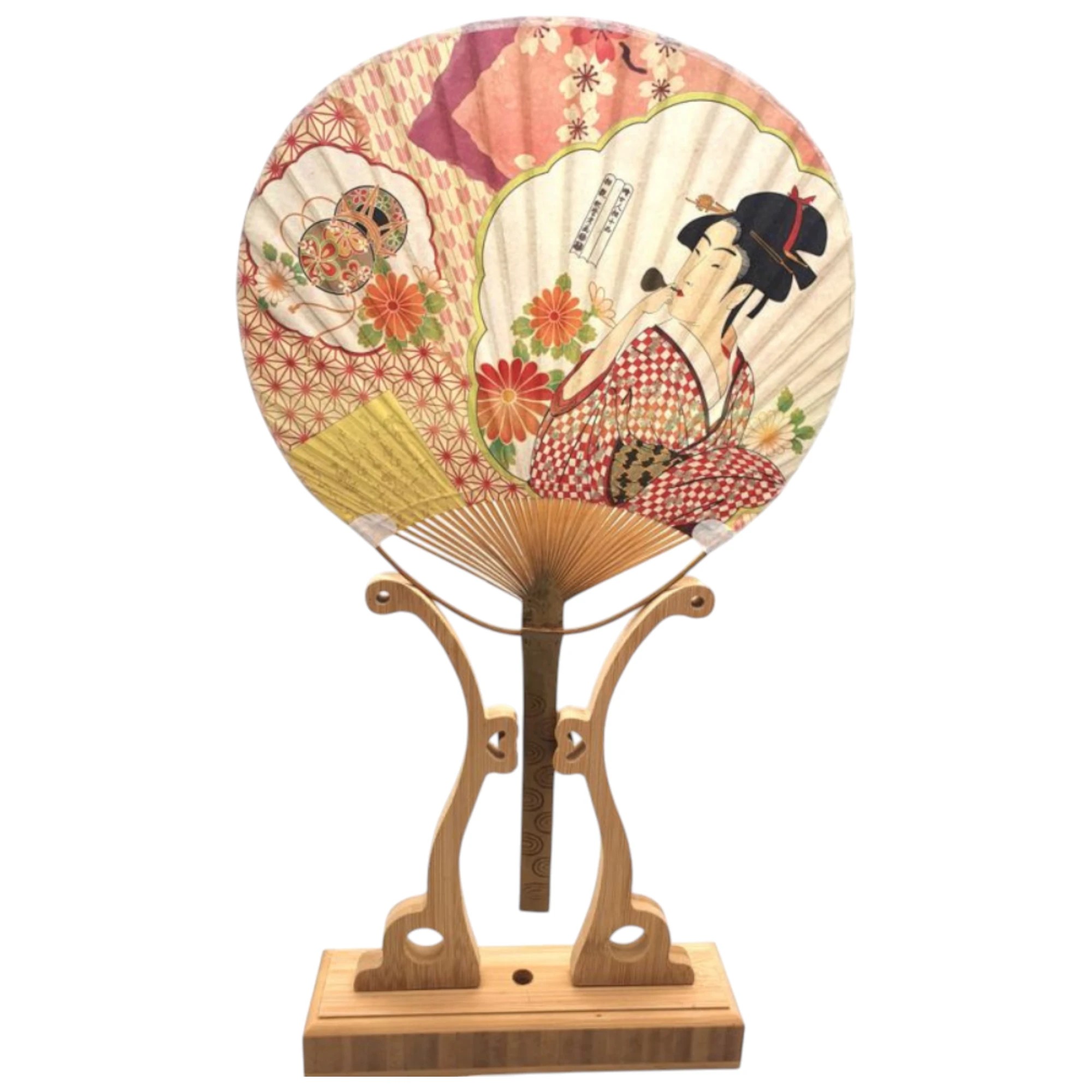 Apportez une touche d'élégance japonaise à votre quotidien avec cet éventail japonais Uchiwa en papier et bambou, orné d’un motif inspiré d’Hiroshige représentant une Geisha. Fabriqué au Japon avec des matériaux naturels, cet éventail non pliable au style traditionnel est à la fois fonctionnel pour se rafraîchir l’été et décoratif pour embellir votre intérieur. Léger et raffiné, il incarne le charme intemporel de l’artisanat japonais.