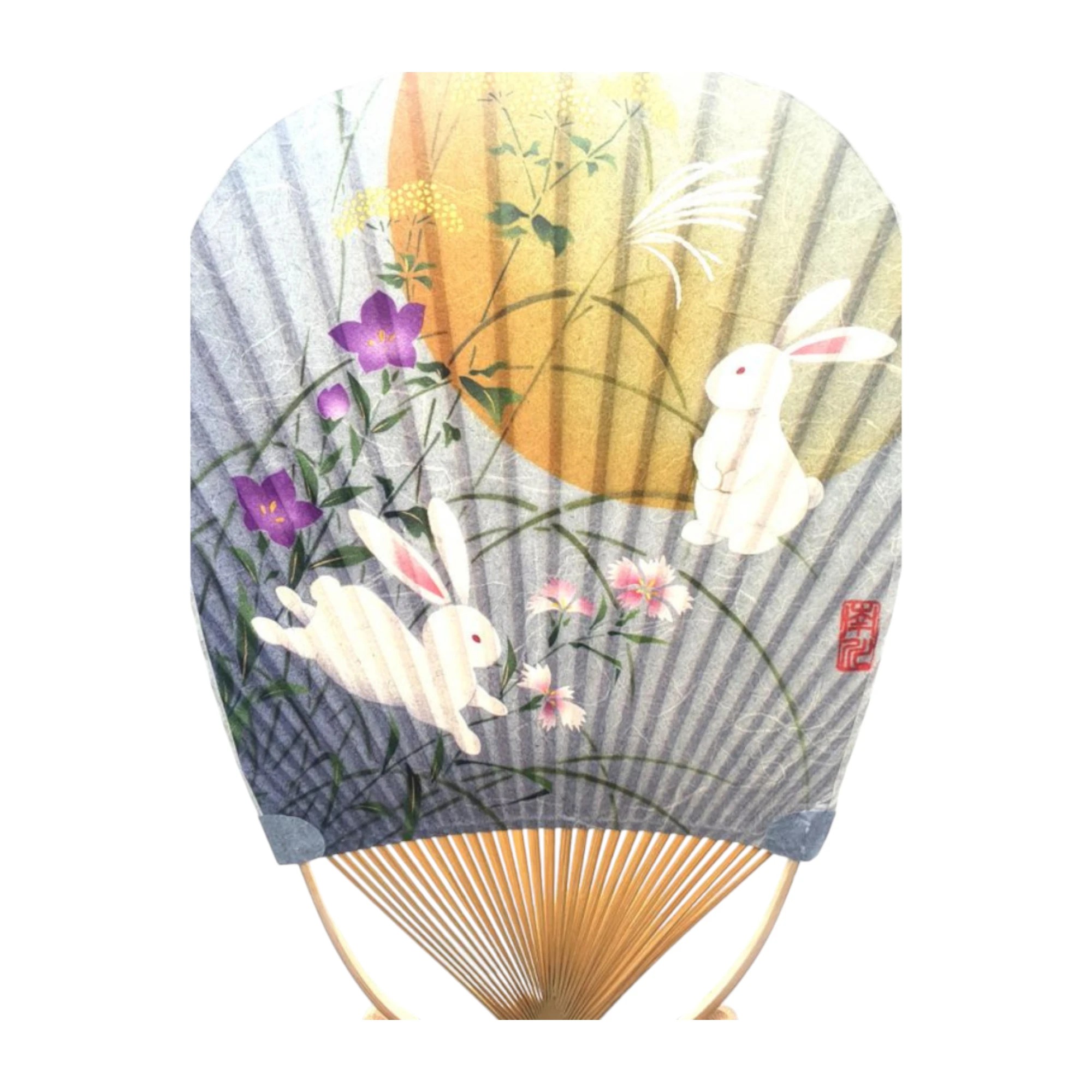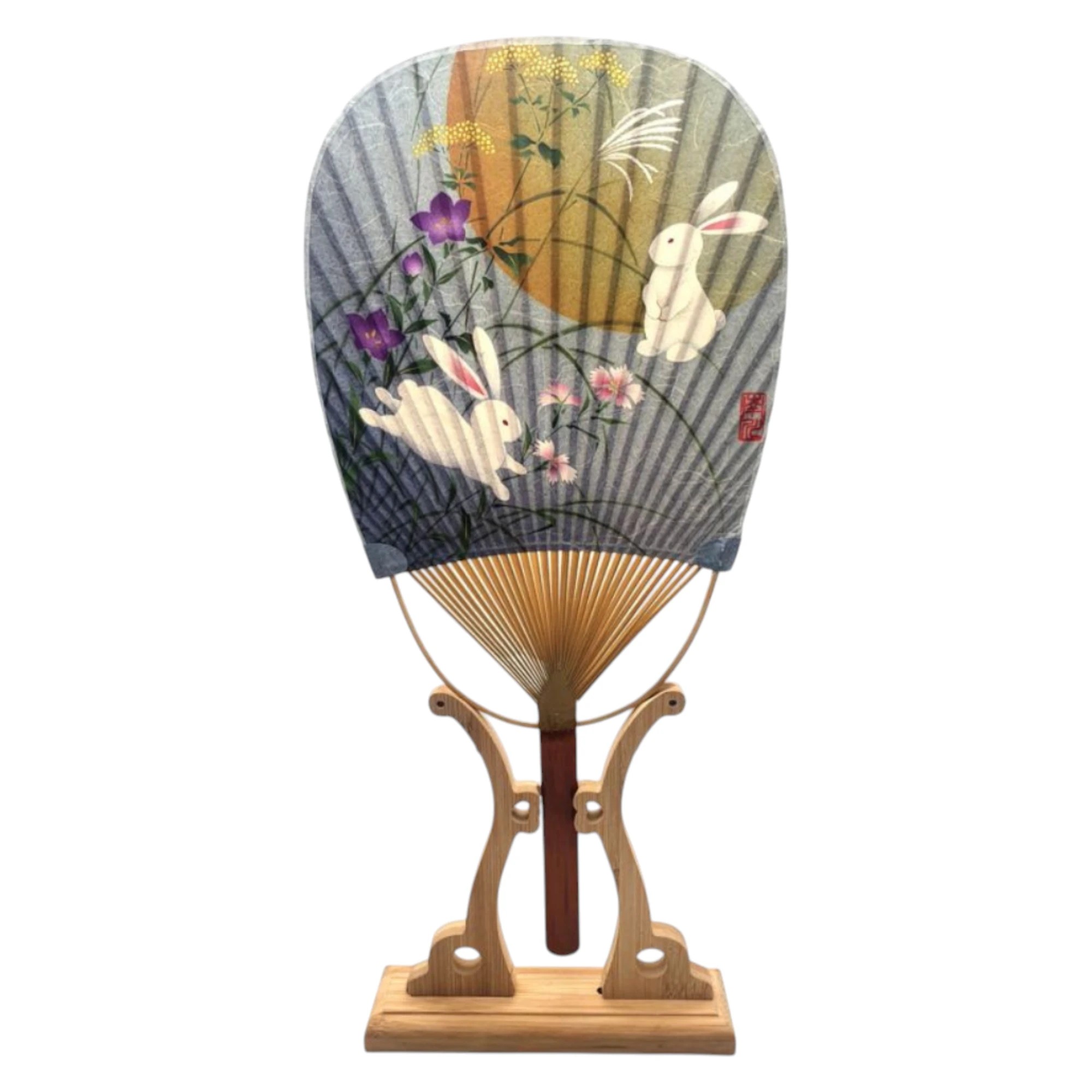 Ajoutez une touche de douceur et de nature à votre intérieur ou à vos journées d’été avec cet éventail japonais Uchiwa au motif poétique de lapin dans le jardin. Fabriqué à la main au Japon, cet éventail traditionnel non pliable marie le bambou Moso naturel et du papier japonais pour une finition élégante. Utilisé pour se rafraîchir ou comme élément décoratif, il incarne à la fois raffinement et tradition.