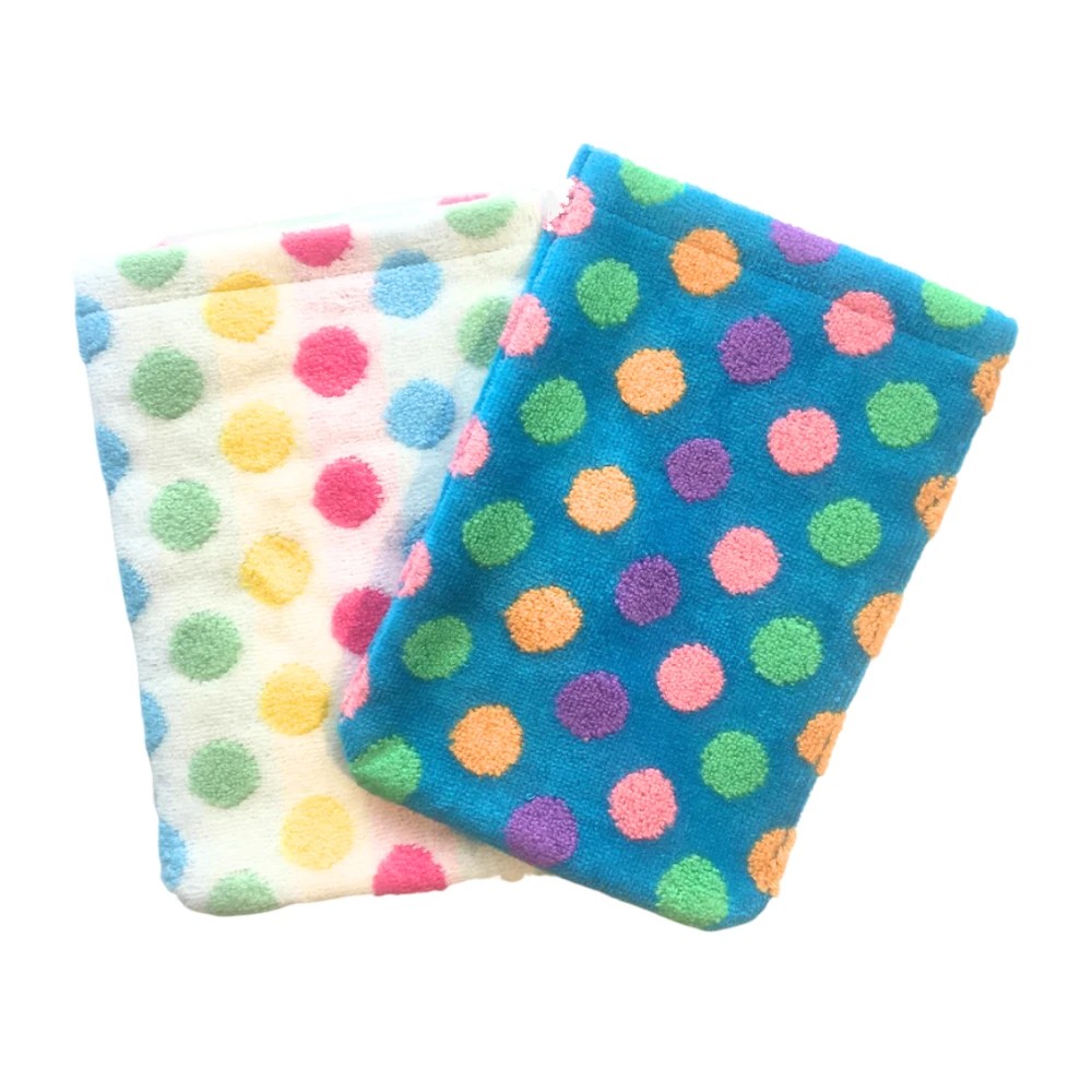 Disponible en bleu ou blanc, son motif à pois multicolores apporte un style joyeux et élégant. Grâce à sa fermeture bouton pression, la main reste bien maintenue à l’intérieur pour un usage confortable.