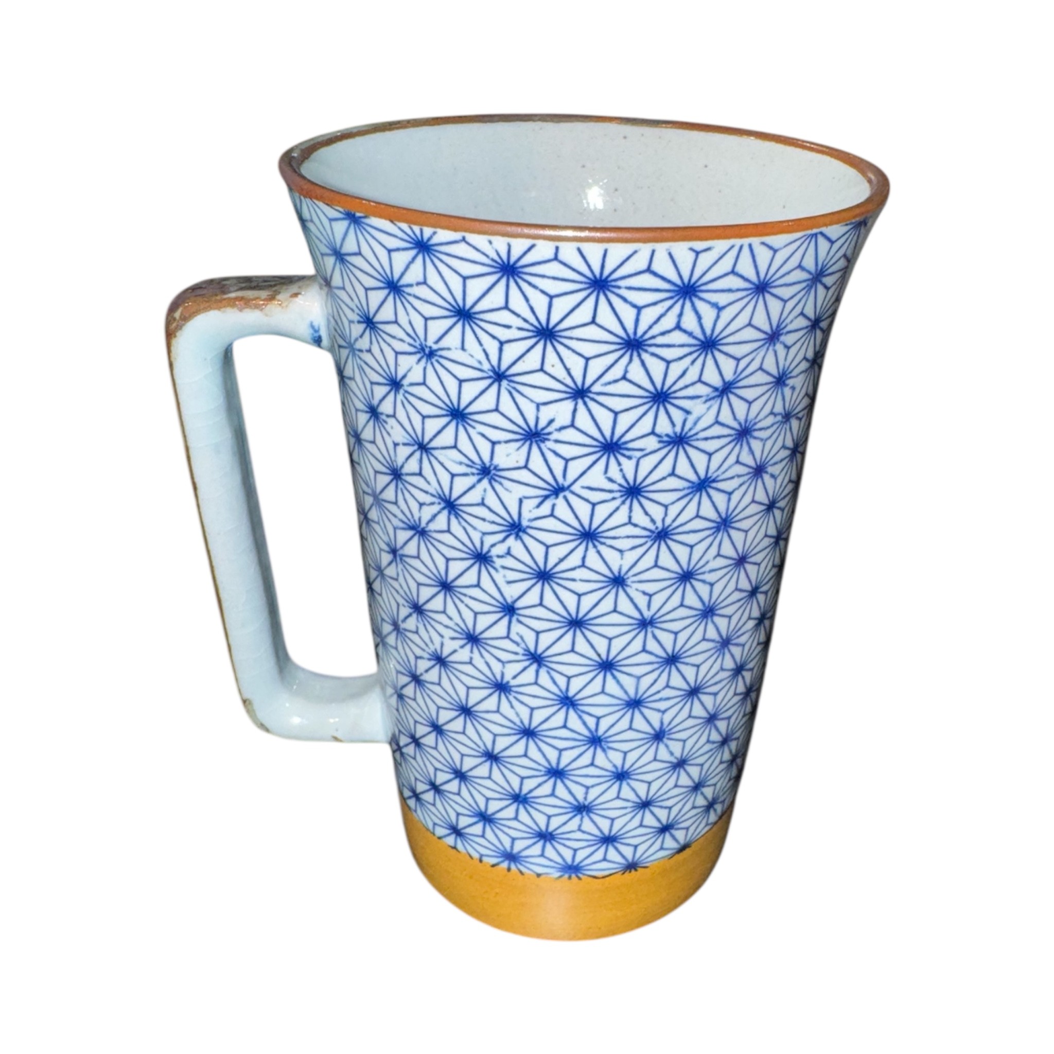 Ce grand mug japonais en grès, fabriqué à la main au Japon, se distingue par son élégant motif Asanoha bleu aux lignes étoilées. D’une généreuse contenance de 730 ml, il est traditionnellement utilisé comme chope à bière japonaise, mais convient parfaitement pour le thé, les infusions ou toute boisson chaude ou froide.