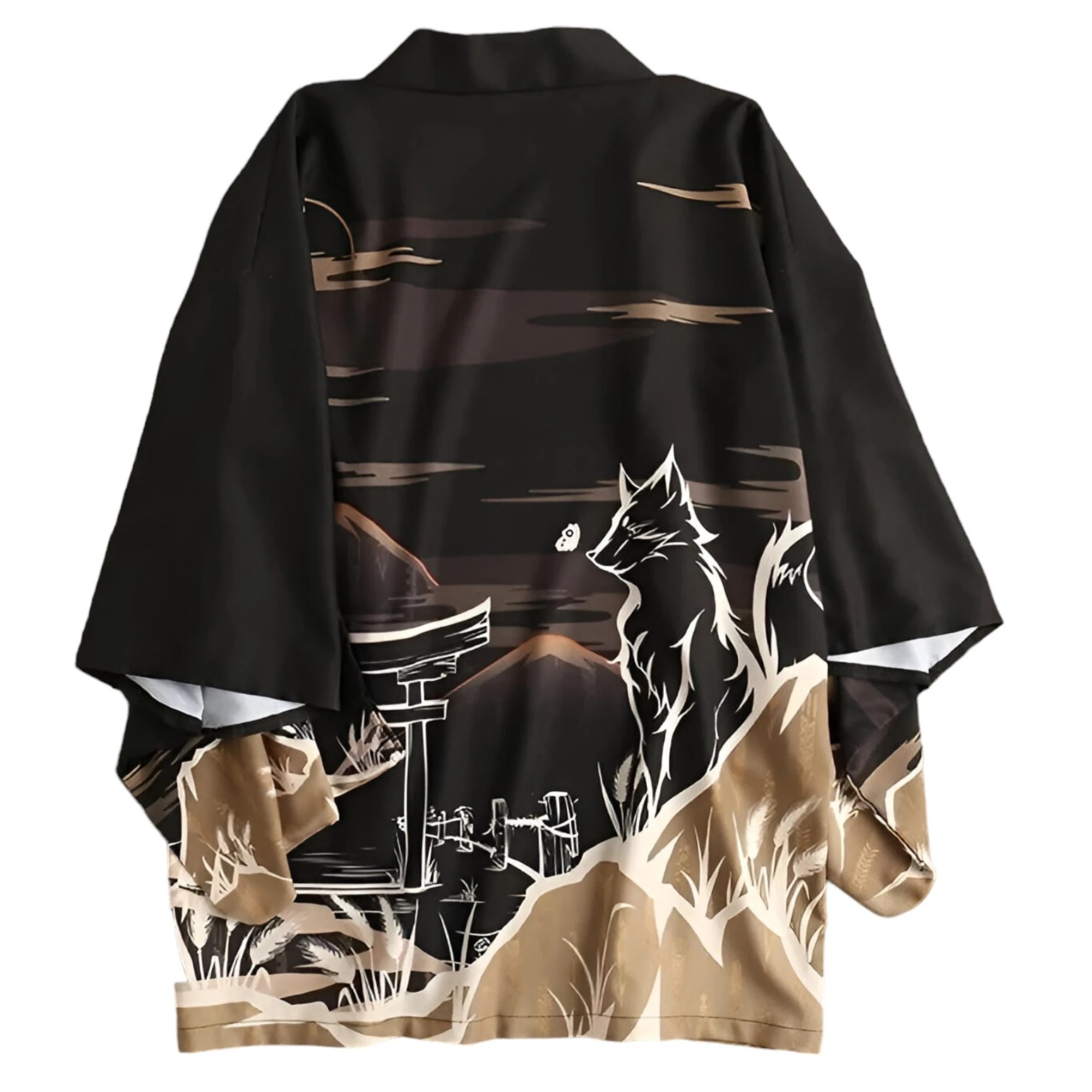 Découvrez une veste de kimono unisexe inspirée des codes de la street fashion japonaise. Cette pièce représente un kitsune, le renard légendaire du folklore nippon, contemplant un torii traditionnel au cœur d’un paysage montagneux. Une esthétique harmonieuse qui évoque le mystère, la spiritualité et la poésie du Japon.
