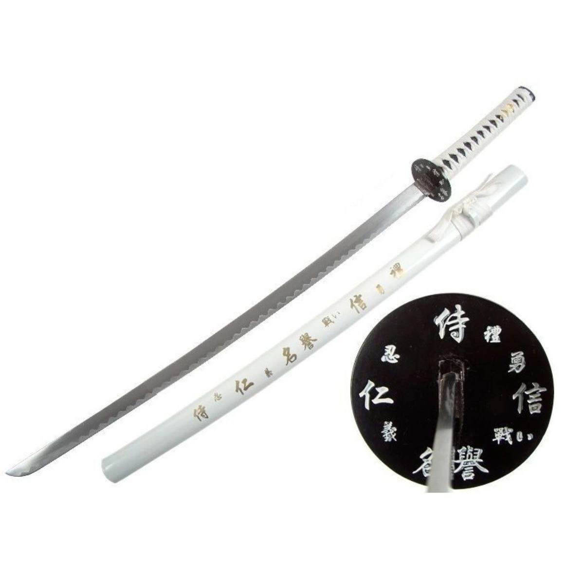 Modern and Past a le plaisir de vous présenter ce magnifique katana japonais de décoration, de couleur blanche immaculée et orné de Kanji traditionnels.