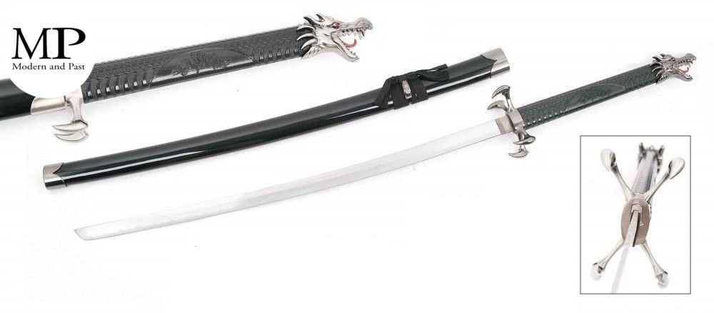 Son design noir intense est sublimé par une garde en forme de patte de dragon et un pommeau sculpté en tête de dragon, incarnant la force, la protection et la sagesse dans la culture japonaise.