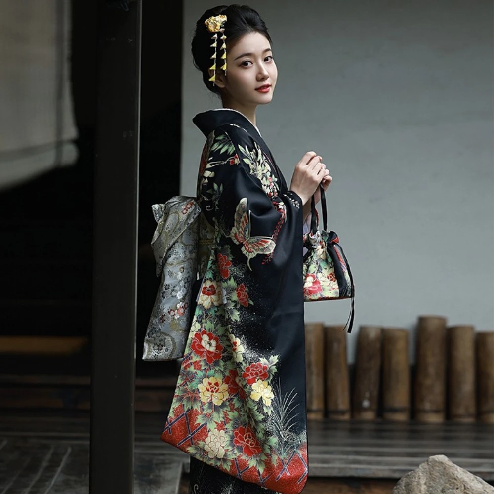Ce kimono traditionnel japonais pour femme séduit par son fond noir profond rehaussé de motifs floraux raffinés. Inspiré des tenues portées lors des grandes occasions au Japon, il incarne l’élégance et la symbolique de la culture japonaise.