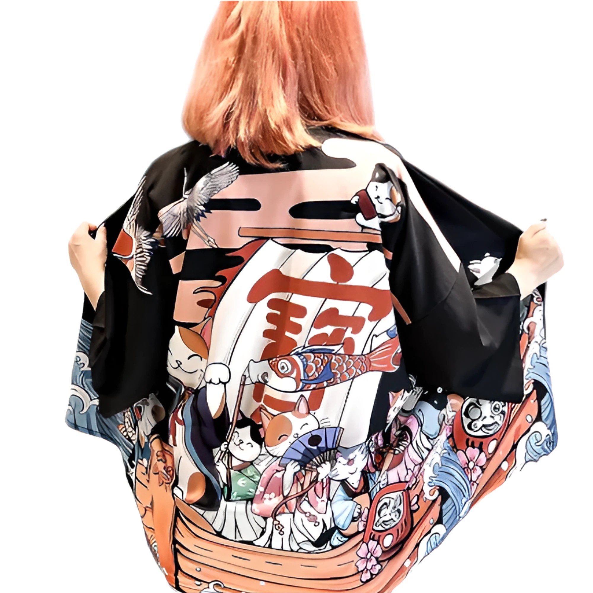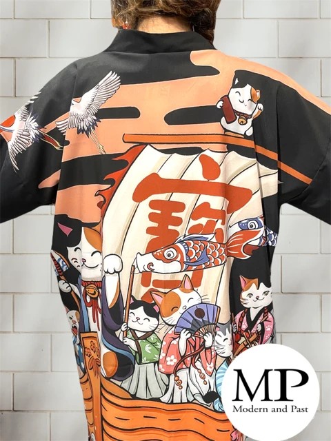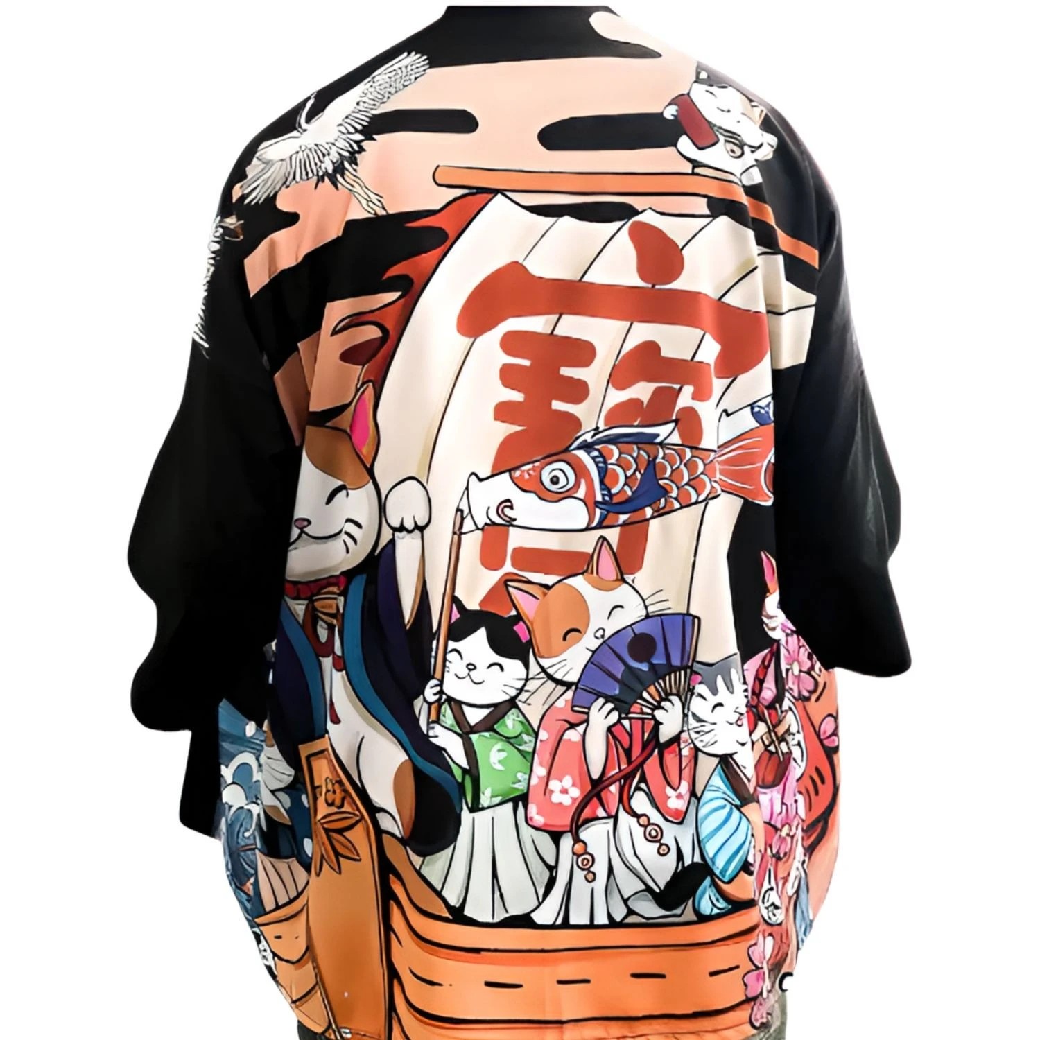 Découvrez une veste de kimono moderne illustrant une scène festive de chats japonais Neko, parfaite pour un style street fashion inspiré du Japon. Confortable, légère et fabriquée dans un polyester de qualité, cette pièce unisexe apporte couleur et originalité à votre tenue.