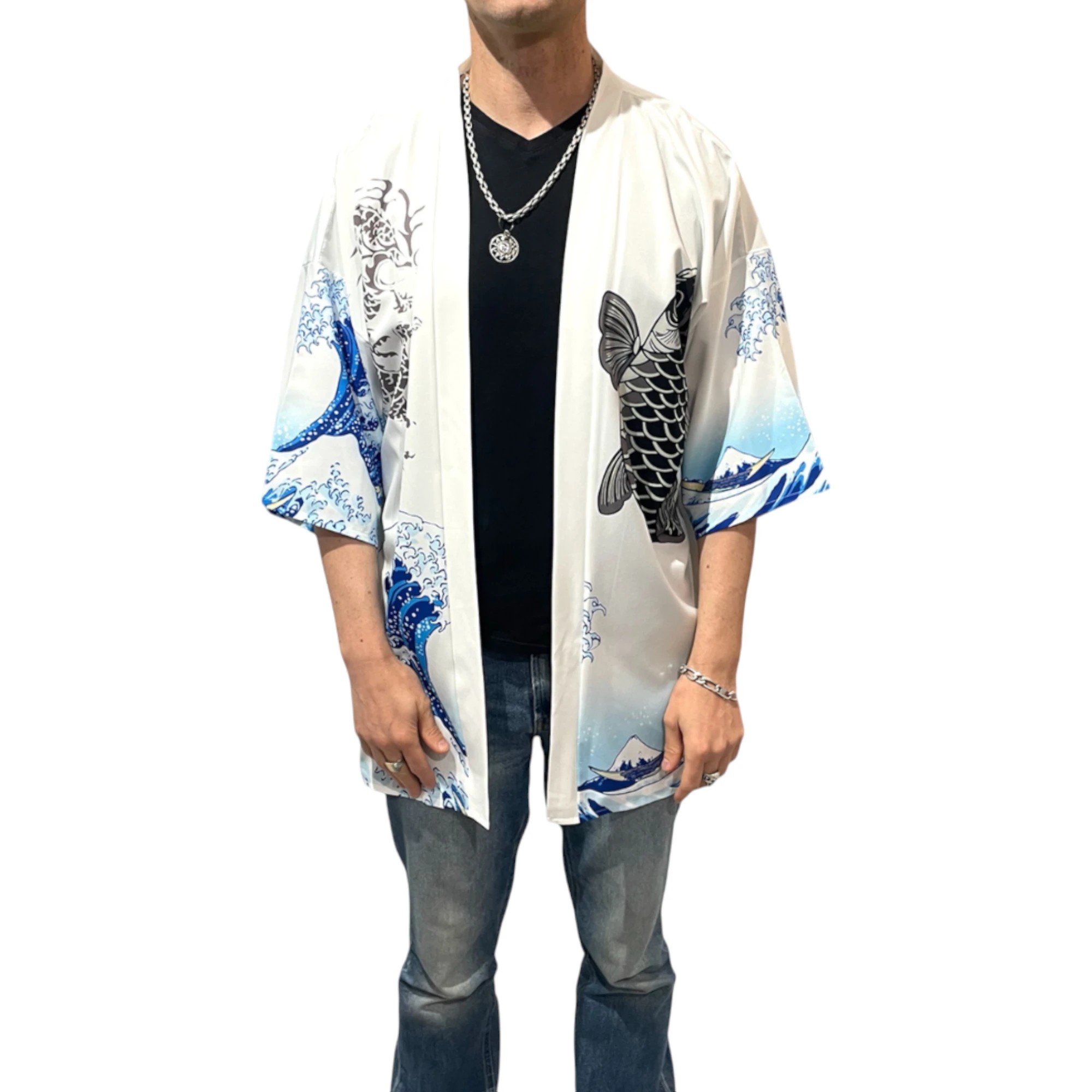 Ce Kimono représente la célèbre vague au Japon, la Vague de Kanagawa, ainsi que la carpe Koï qui symbolise la bravoure, la persévérance et le courage qui une fois la porte du dragon passée, se transforme en dragon.