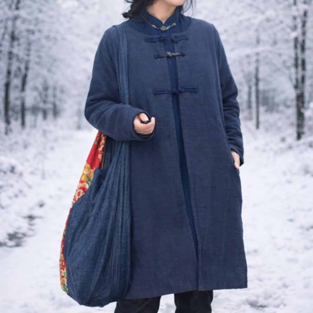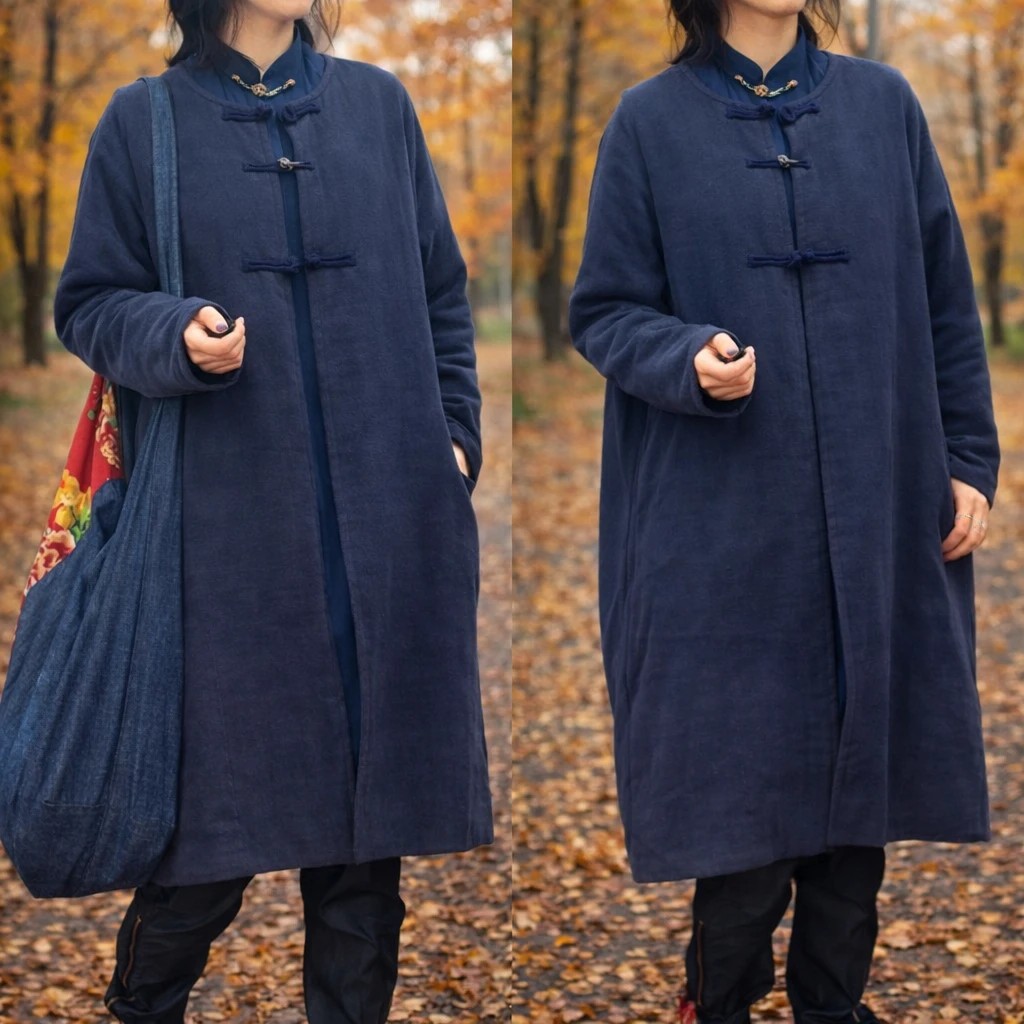 Ce manteau asiatique bleu uni mi-long séduit par son style épuré et sa teinte profonde, inspirée des vêtements traditionnels asiatiques. Sa coupe droite et ample assure une grande liberté de mouvement tout en offrant une silhouette élégante et équilibrée.