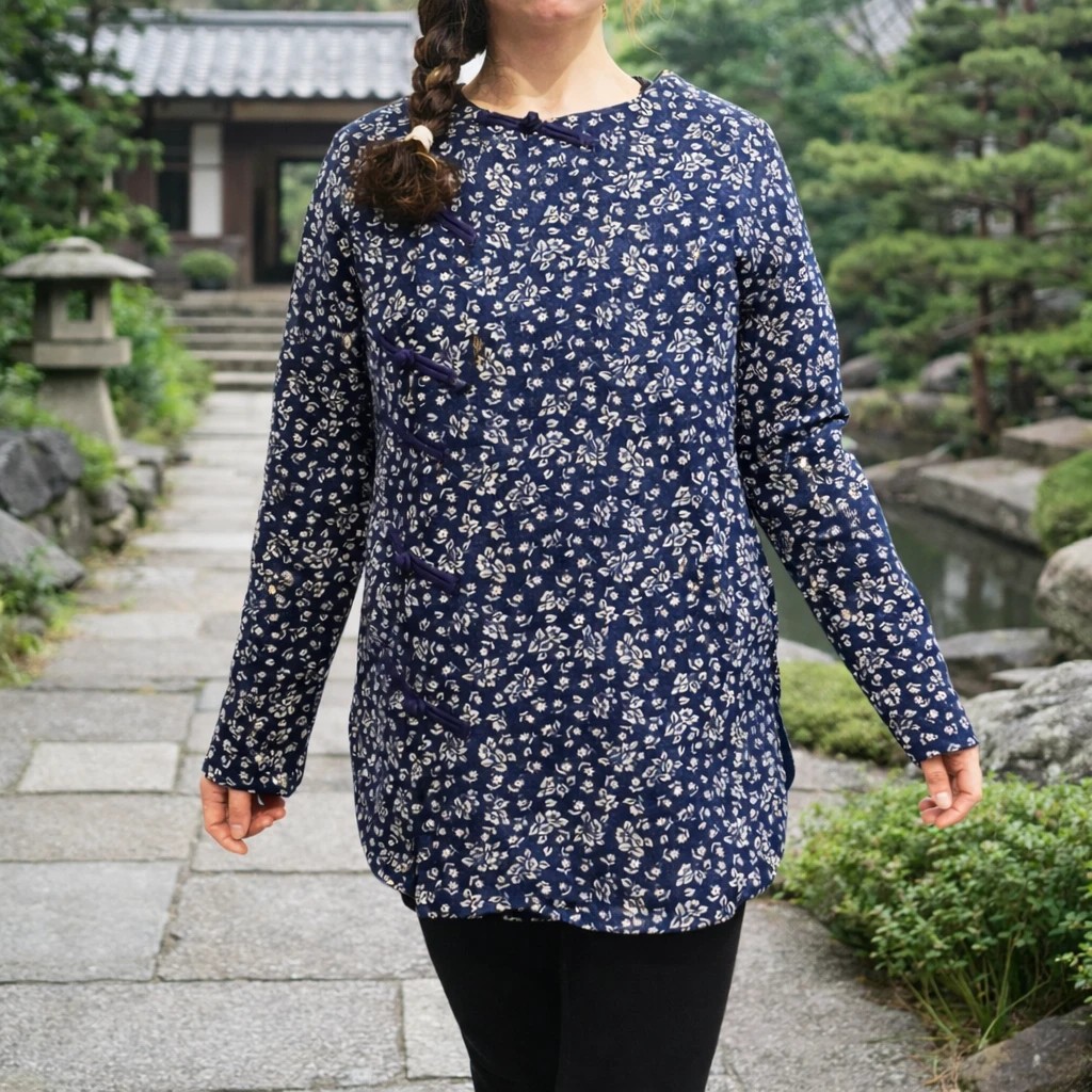 Modern and Past vous présente ce manteau asiatique épais bleu, conçu dans un mélange naturel de coton et de lin. Son motif à fleurs blanches apporte une touche élégante et apaisante, idéale pour un style zen et intemporel.
