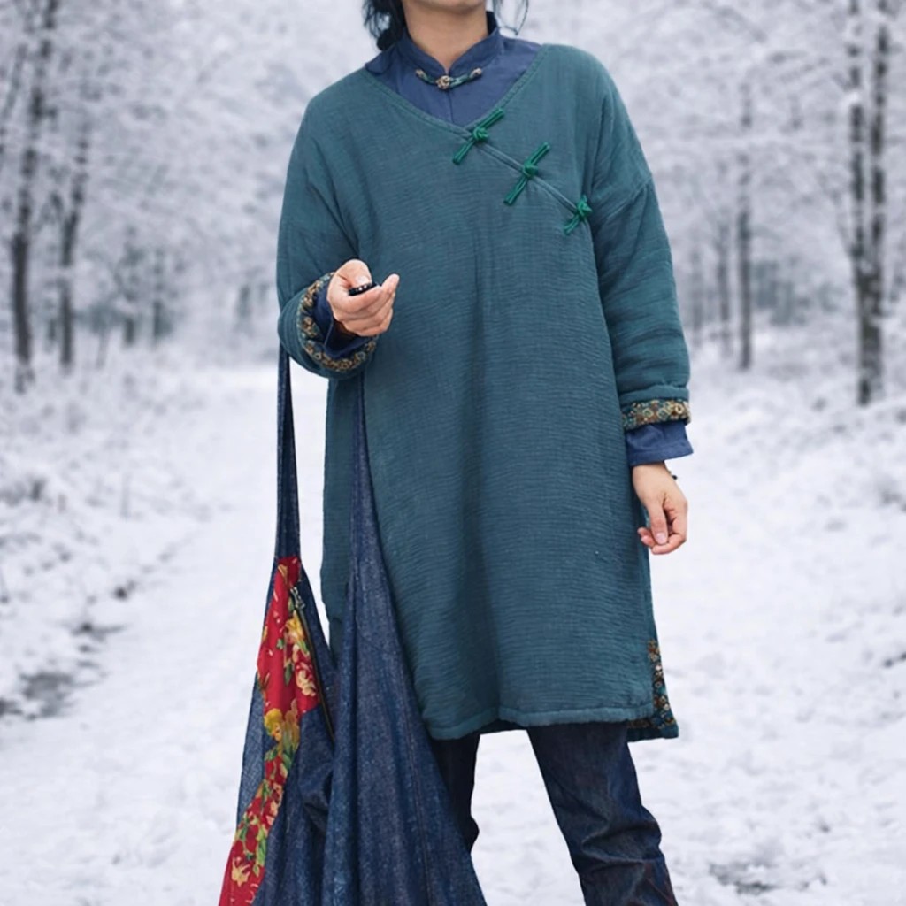 Confectionné dans un mélange équilibré de coton et laine, ce manteau bénéficie d’une double couche de haute qualité associée à une doublure en fibres naturelles de coton. Il offre ainsi une excellente protection contre le froid tout en restant respirant et agréable à porter. Sa fermeture latérale par boutonnage renforce son caractère authentique et sa polyvalence, aussi bien pour l’intérieur que pour l’extérieur. Un vêtement idéal pour une allure zen, chic et écoresponsable.