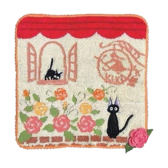 Cette mini serviette Jiji souriante revisite l’univers de Kiki la Petite Sorcière avec un motif brodé représentant Jiji entouré de délicieuses pâtisseries. Sa texture douce et son style raffiné en font un accessoire idéal pour les fans du Studio Ghibli.