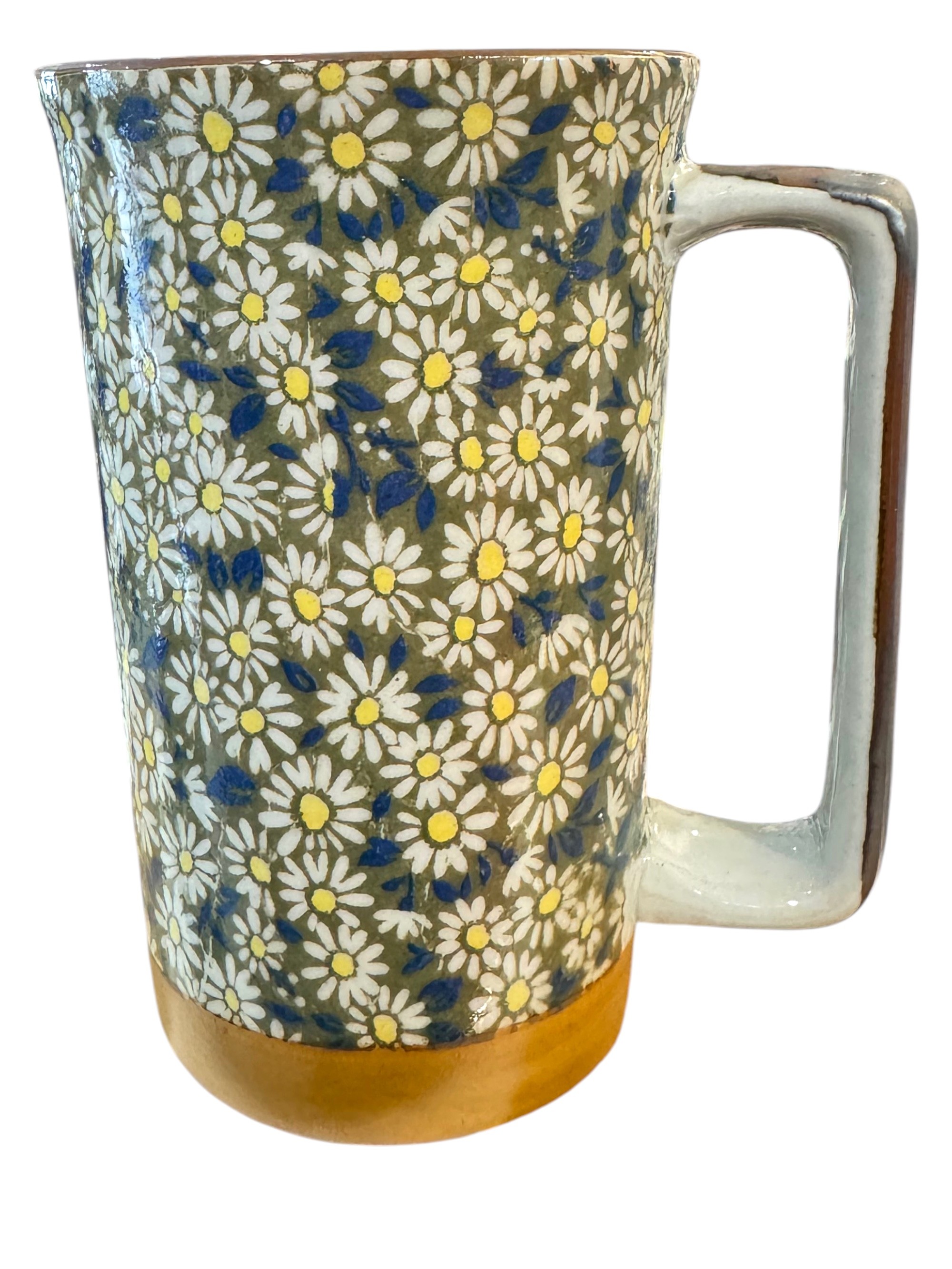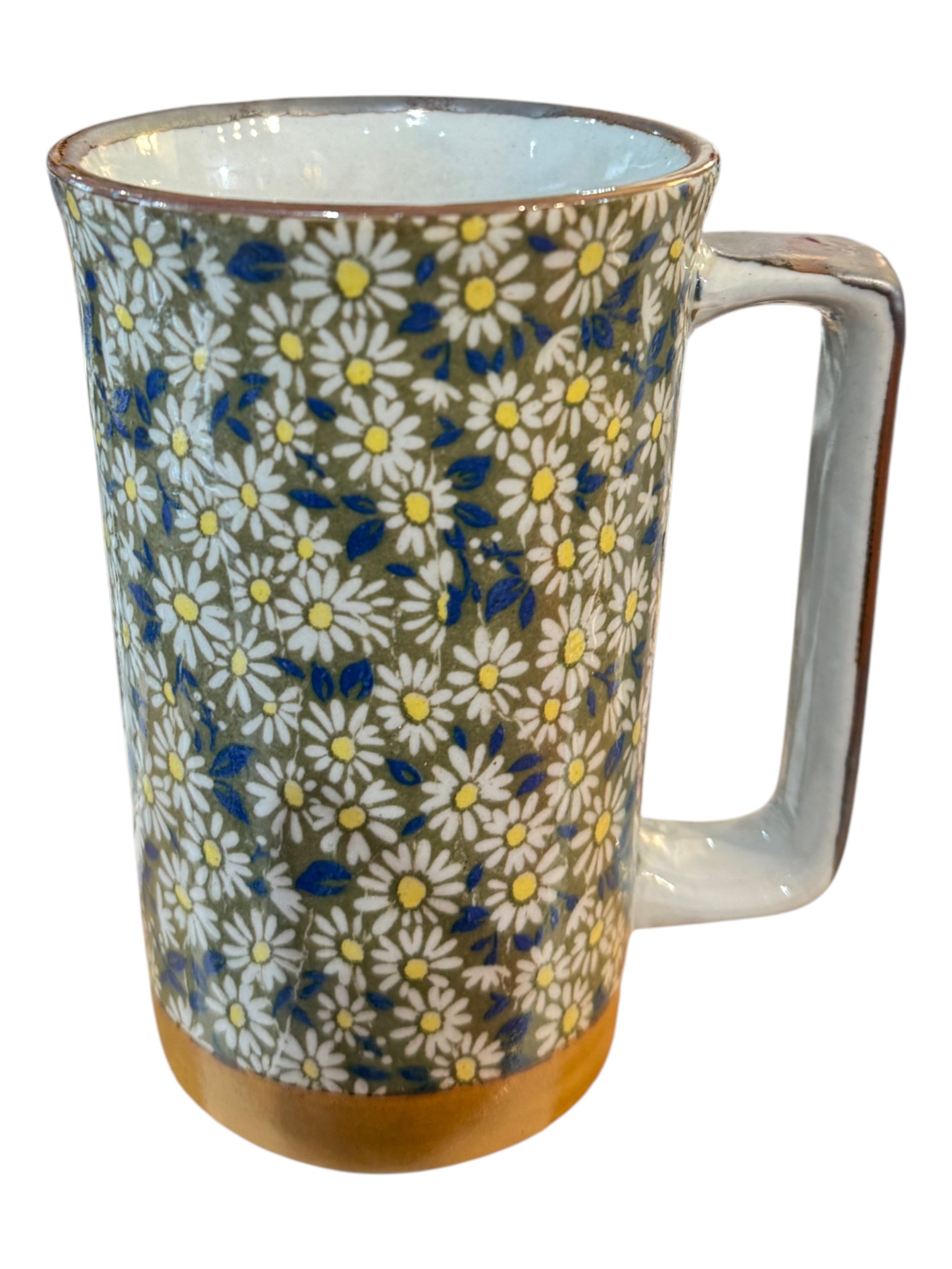 Savourez vos boissons préférées dans ce mug japonais en grès vert kaki, orné de motifs de fleurs de marguerites et de feuilles bleues.