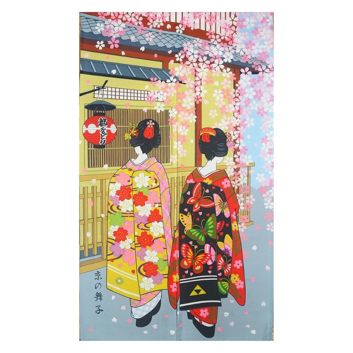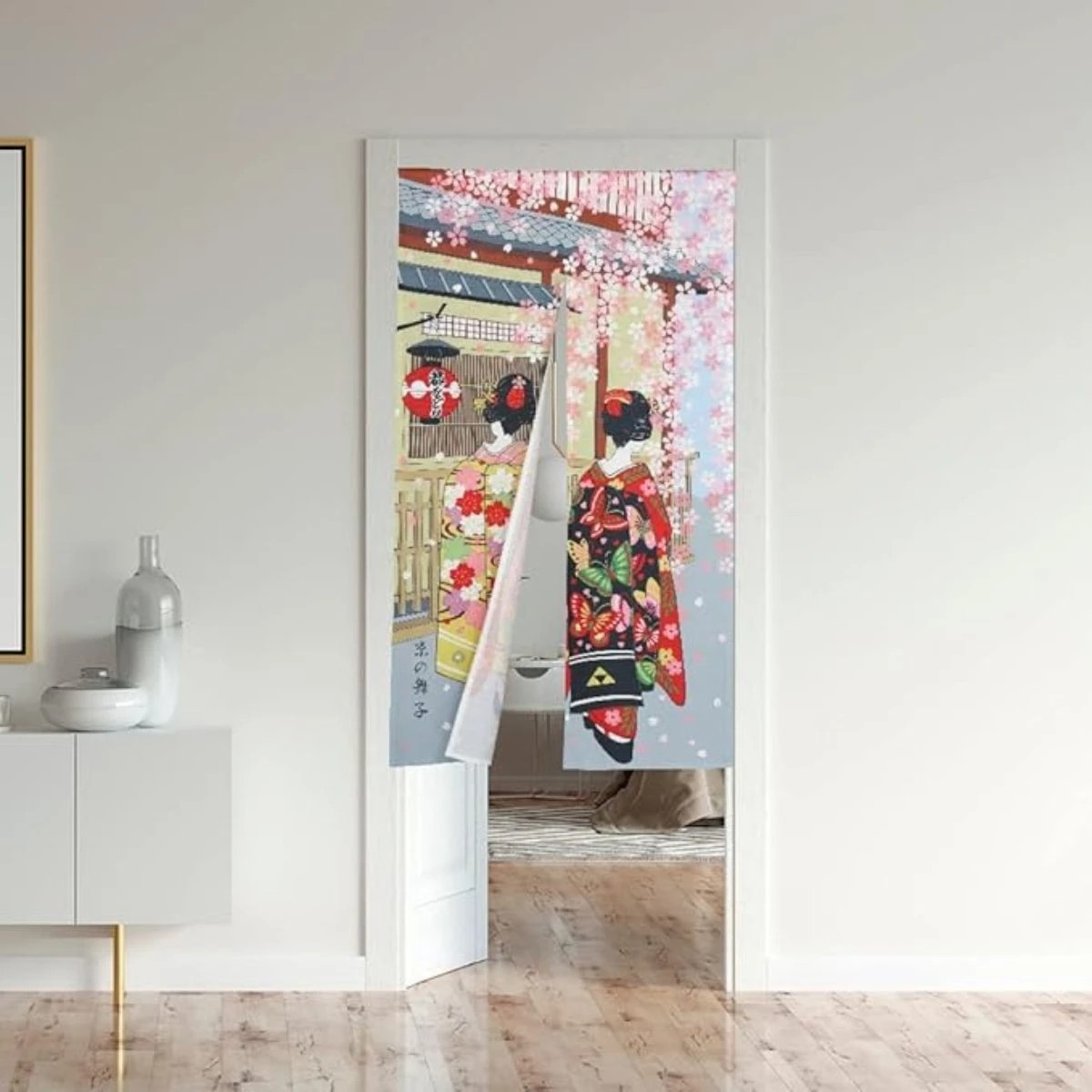 Ce Noren japonais Promenade dans le vieux Kyoto est un véritable hommage aux quartiers historiques de la ville. Avec ses deux geishas élégamment vêtues et ses pétales de sakura, il apporte une atmosphère typiquement japonaise à votre intérieur.