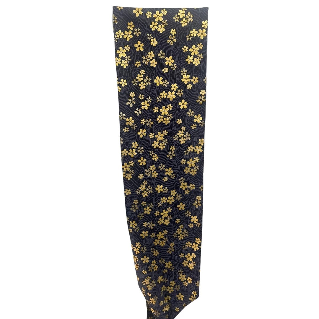 Cet obi japonais réversible se distingue par ses motifs de petites fleurs dorées, délicats et raffinés. Son fond bleu profond met en valeur les détails lumineux, créant une ceinture à la fois traditionnelle et moderne, idéale pour sublimer un kimono ou compléter une tenue contemporaine.