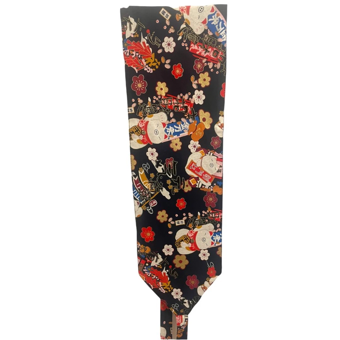 Cet obi japonais réversible met en valeur les adorables Maneki Neko, symboles de chance et de prospérité, associés à de délicates fleurs japonaises. Confectionné en coton, il offre deux styles : un côté imprimé coloré riche en détails et un côté noir uni, idéal pour une tenue plus sobre ou traditionnelle.