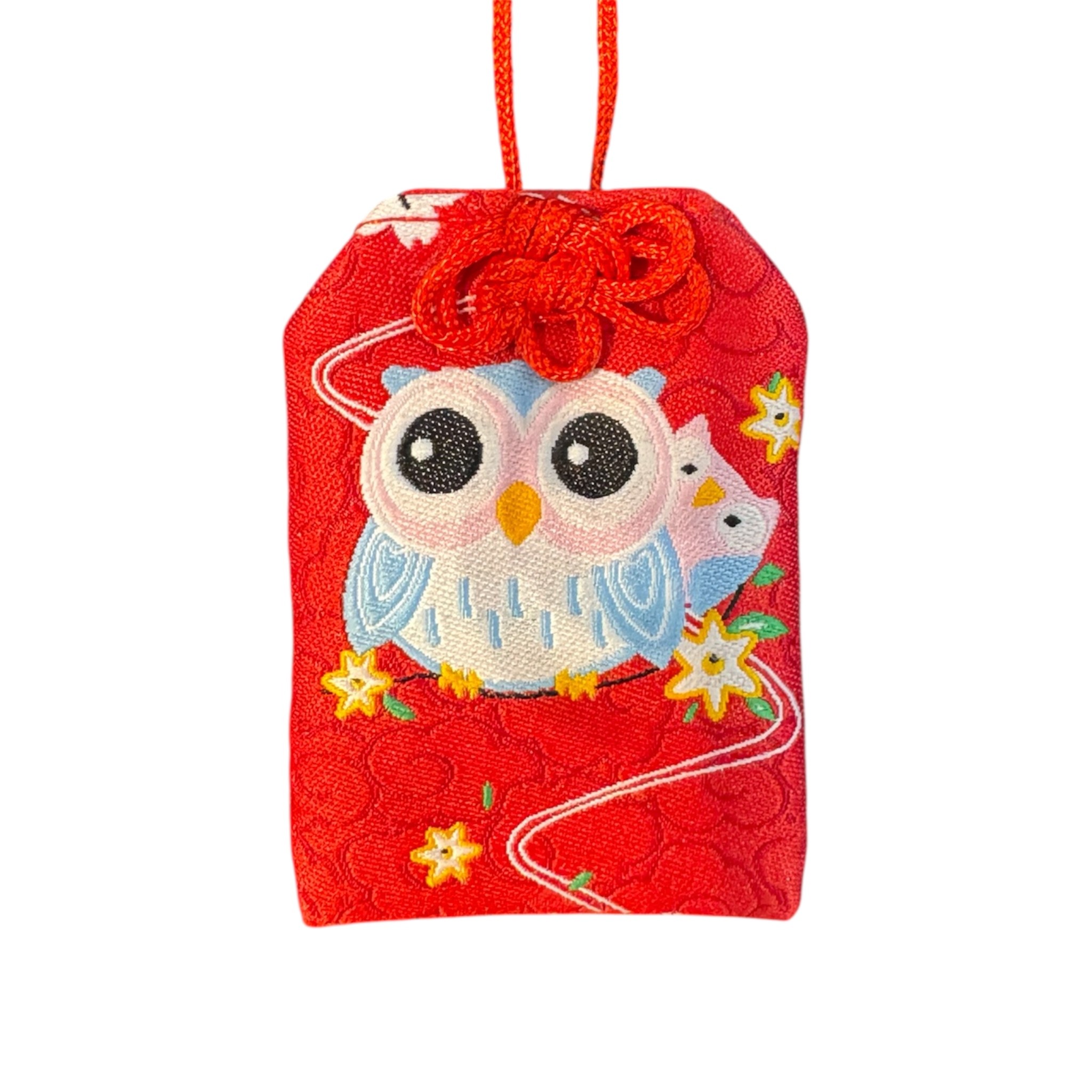 Cet Omamori japonais rouge en tissu est un porte-bonheur traditionnel du Japon. Le recto représente un hibou kawaii accompagné de son bébé, entouré de motifs de nuages et de fleurs, symboles de protection et d’harmonie.