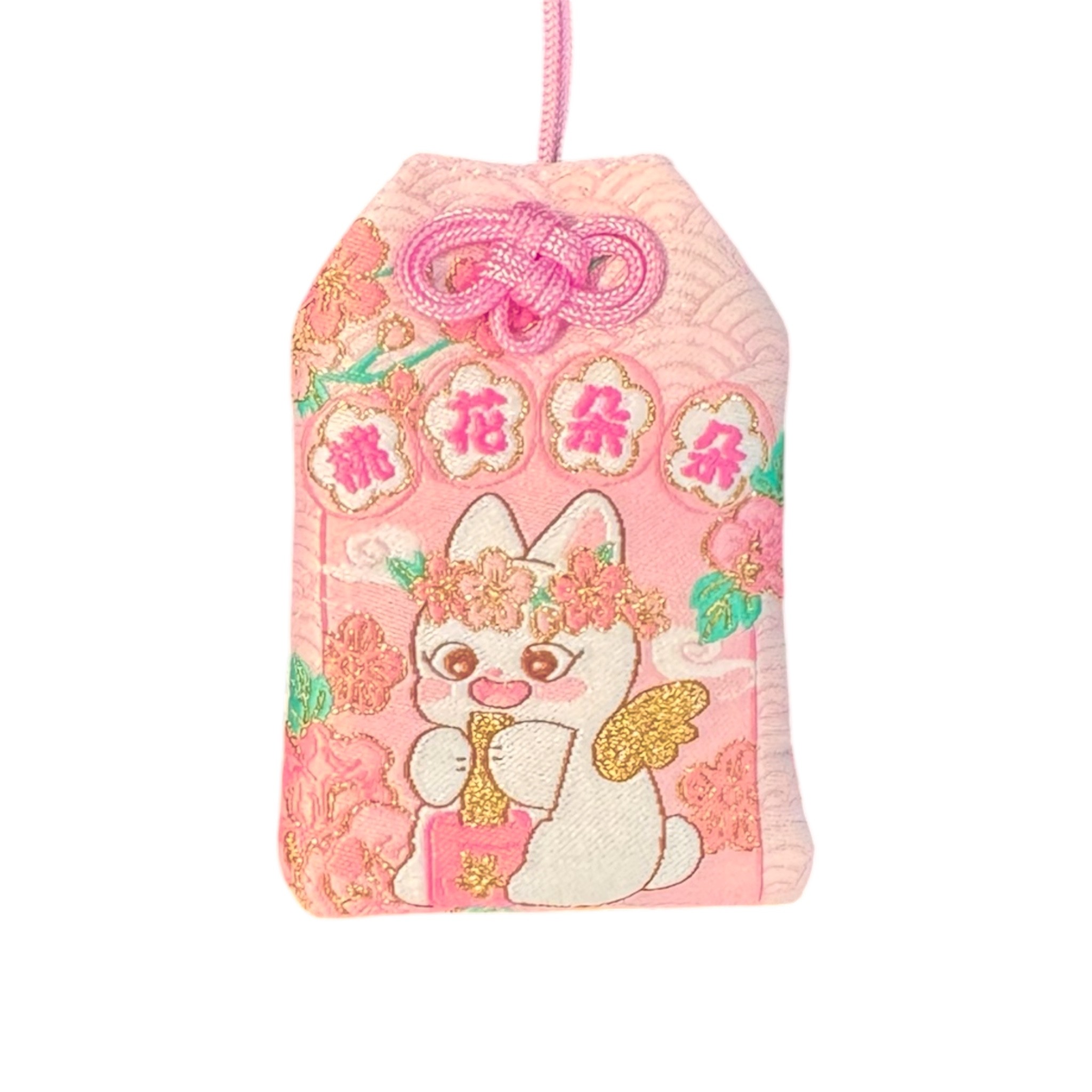 Cet Omamori japonais rose en tissu est un porte-bonheur traditionnel du Japon associé à l’amour et aux rencontres sentimentales. Le recto représente un lapin blanc kawaii assis, portant une couronne de fleurs, entouré de fleurs de cerisier délicates.
