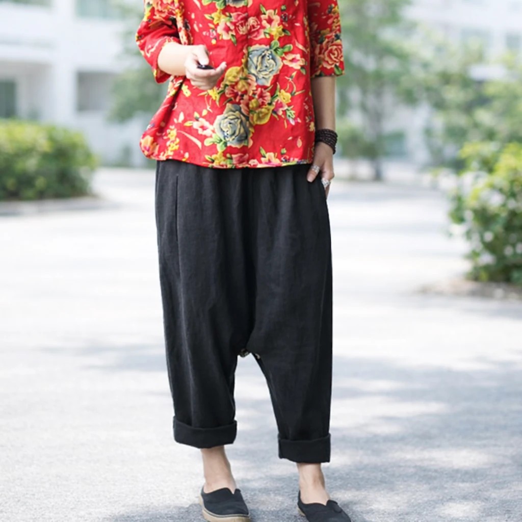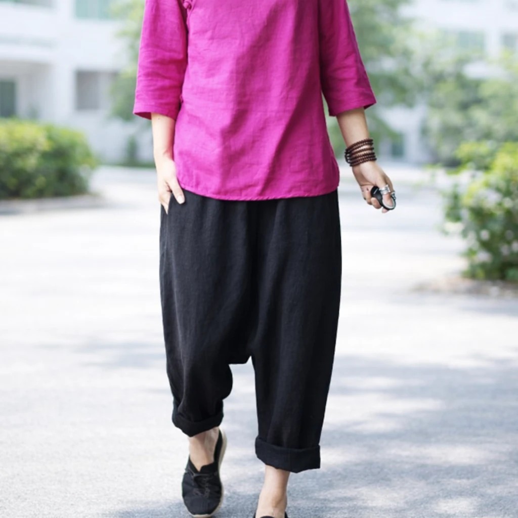 Un pantalon sarouel ethnique noir au style asiatique zen