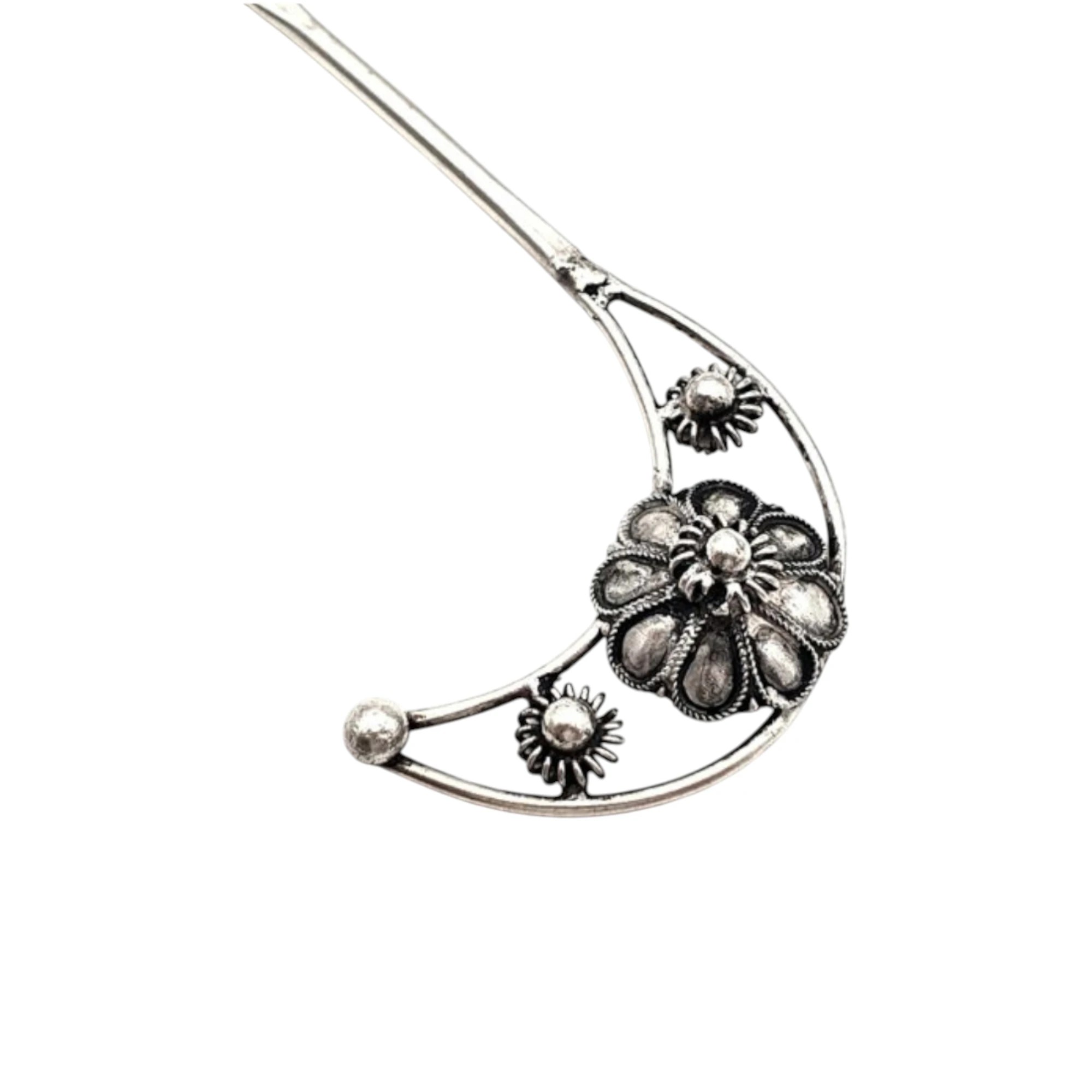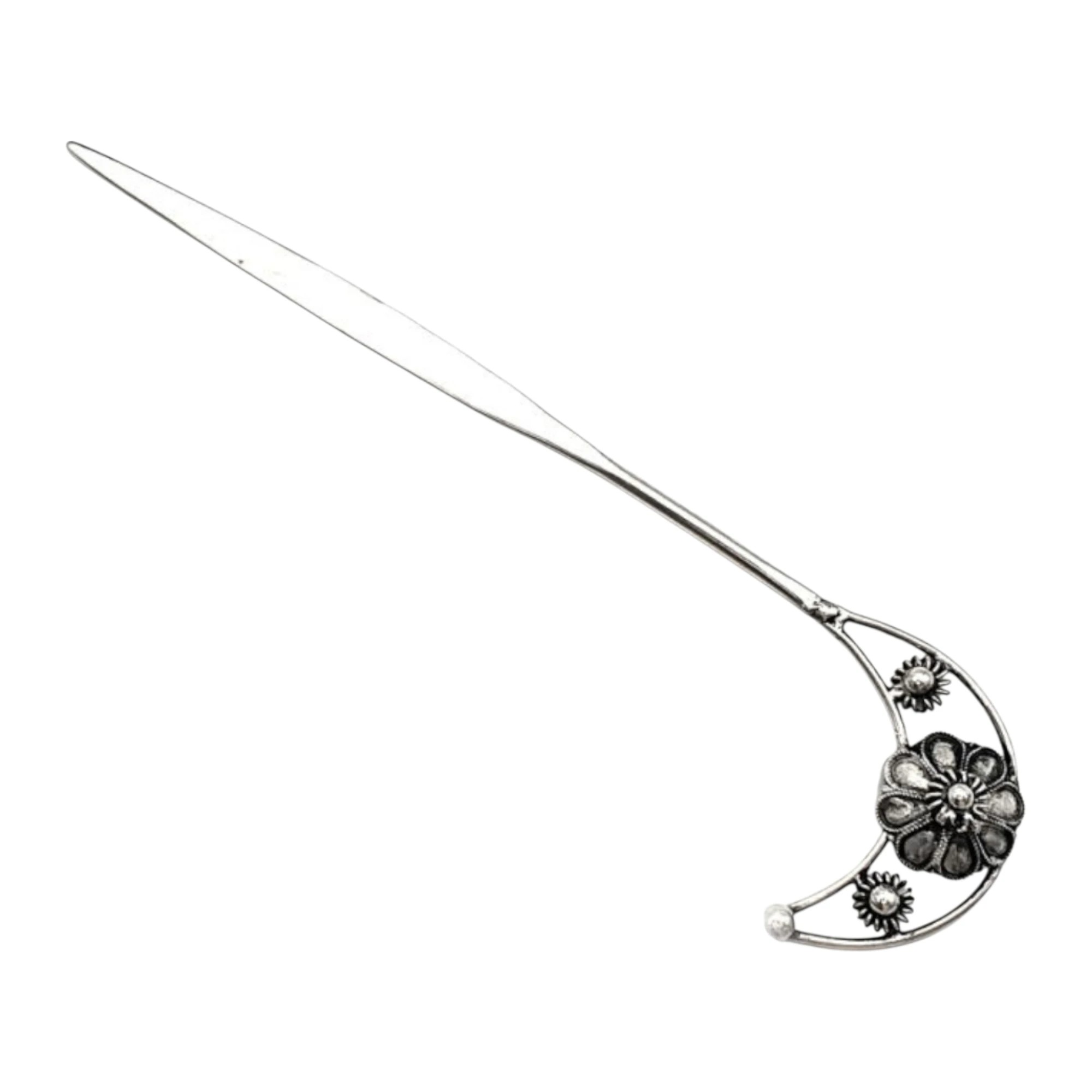 Fabriqué à la main au Japon à partir de cuivre blanc (90 %) et d’argent (moins de 10 %), ce pic fin et long se glisse discrètement dans les cheveux, ne laissant visible que son ornement raffiné. Il est idéal pour structurer chignons et coiffures sophistiquées.