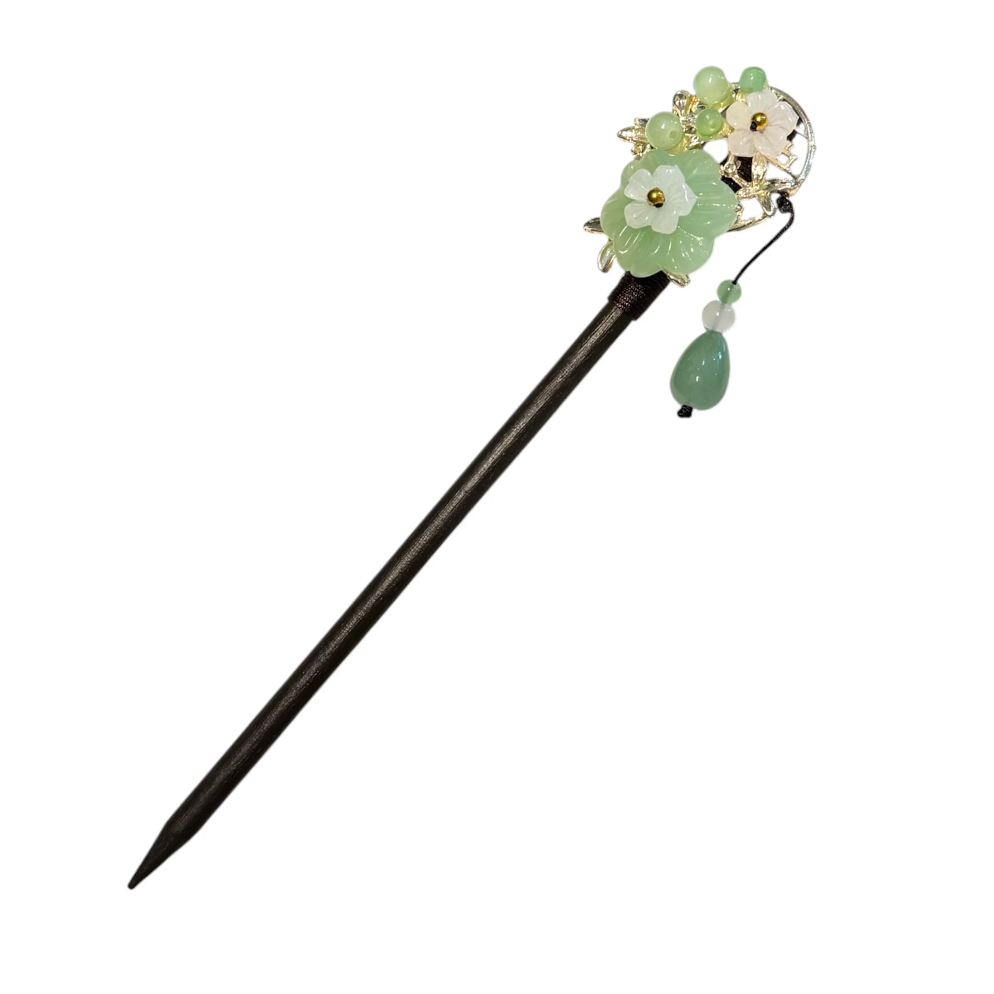Le haut du pic est orné d’un motif floral en bijoux fantaisie en verre, dans de belles nuances vertes, blanches et doré clair.