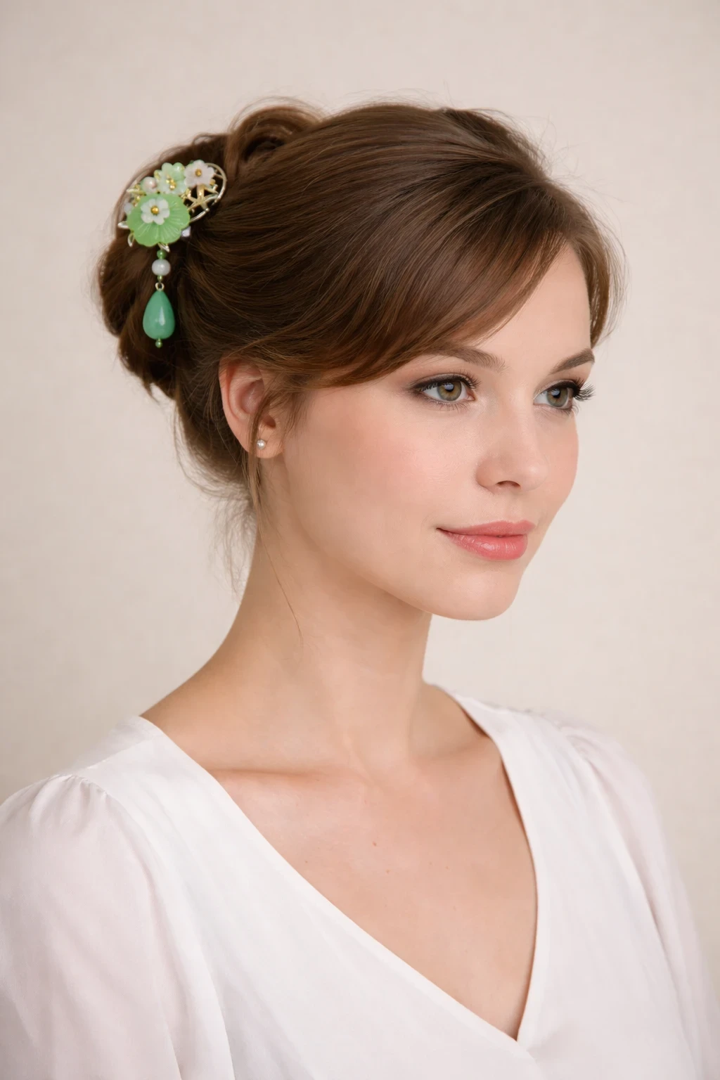 Un pendant imitation cristal vert vient compléter l’ensemble et apporte du mouvement ainsi qu’une note poétique à la coiffure.