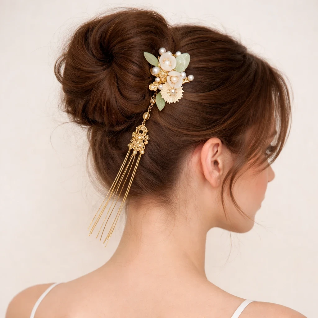 Un pic à cheveux japonais raffiné aux fleurs blanches et pendants dorés