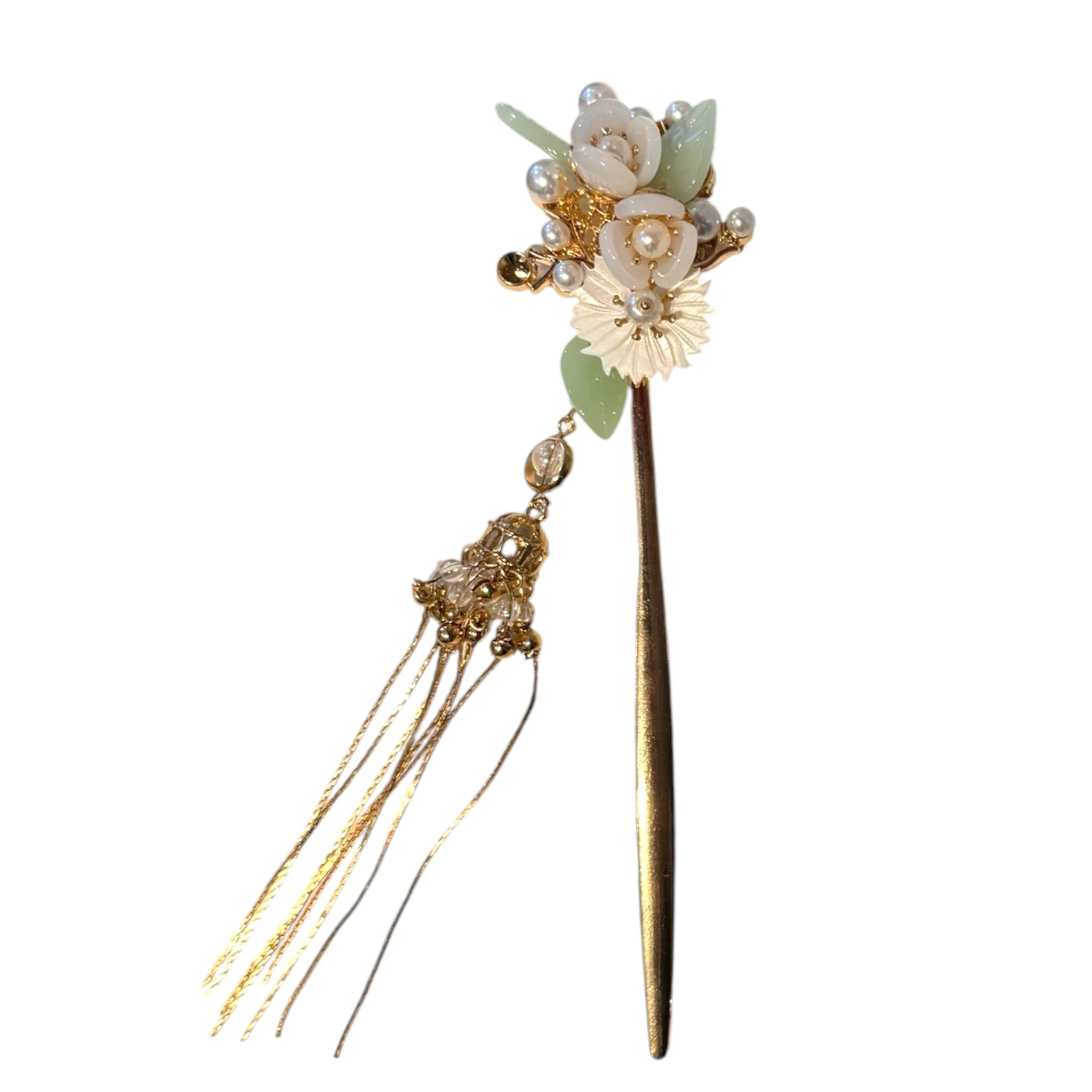 Apportez une touche de délicatesse à votre coiffure avec ce pic à cheveux japonais orné de fleurs blanches en verre, de feuilles vertes en verre et de longs pendants dorés. Son design élégant illumine aussi bien un chignon qu’une coiffure relevée, pour une allure inspirée de l’esthétique japonaise.