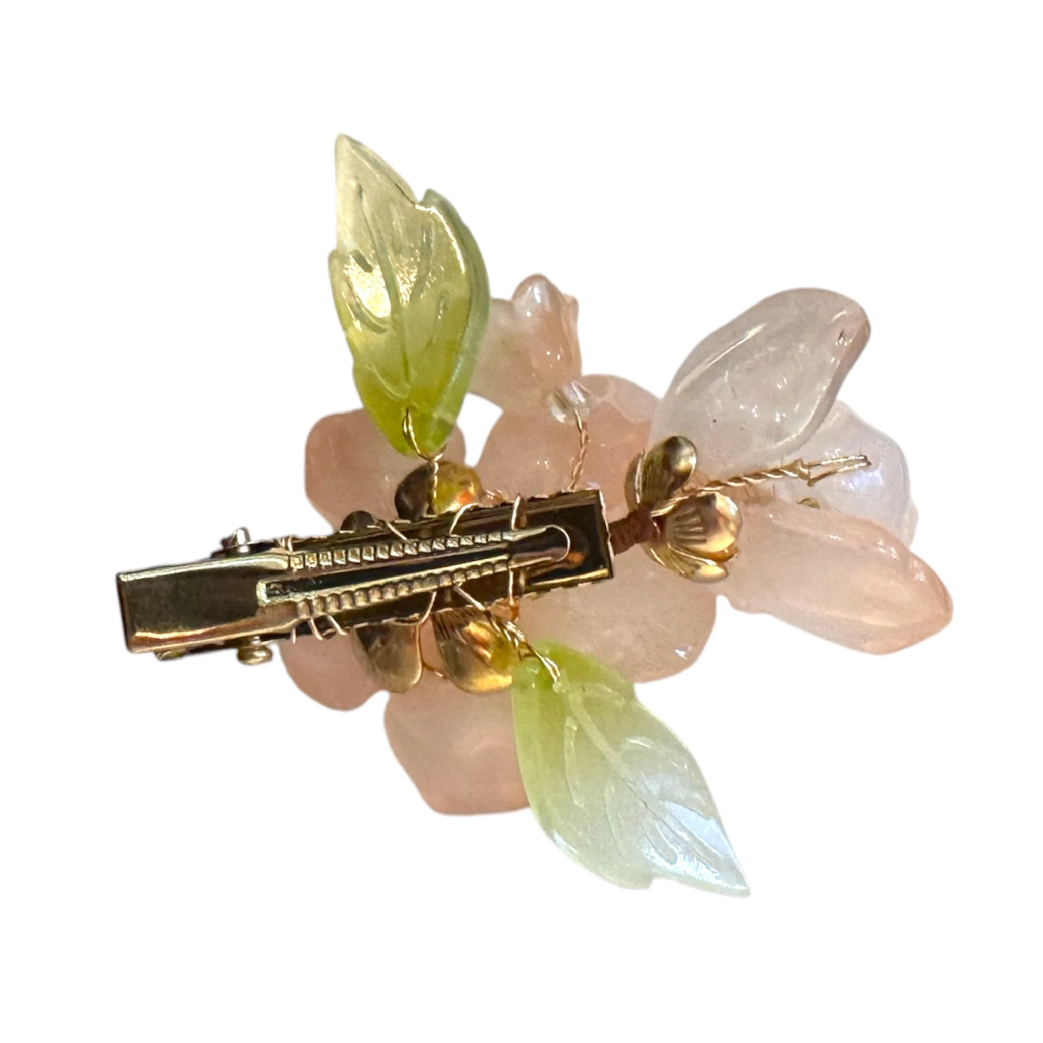 - Décor : 1 grande fleur rose pâle en verre, 1 petite fleur rose pâle en verre, pétales verdâtres en verre, strass