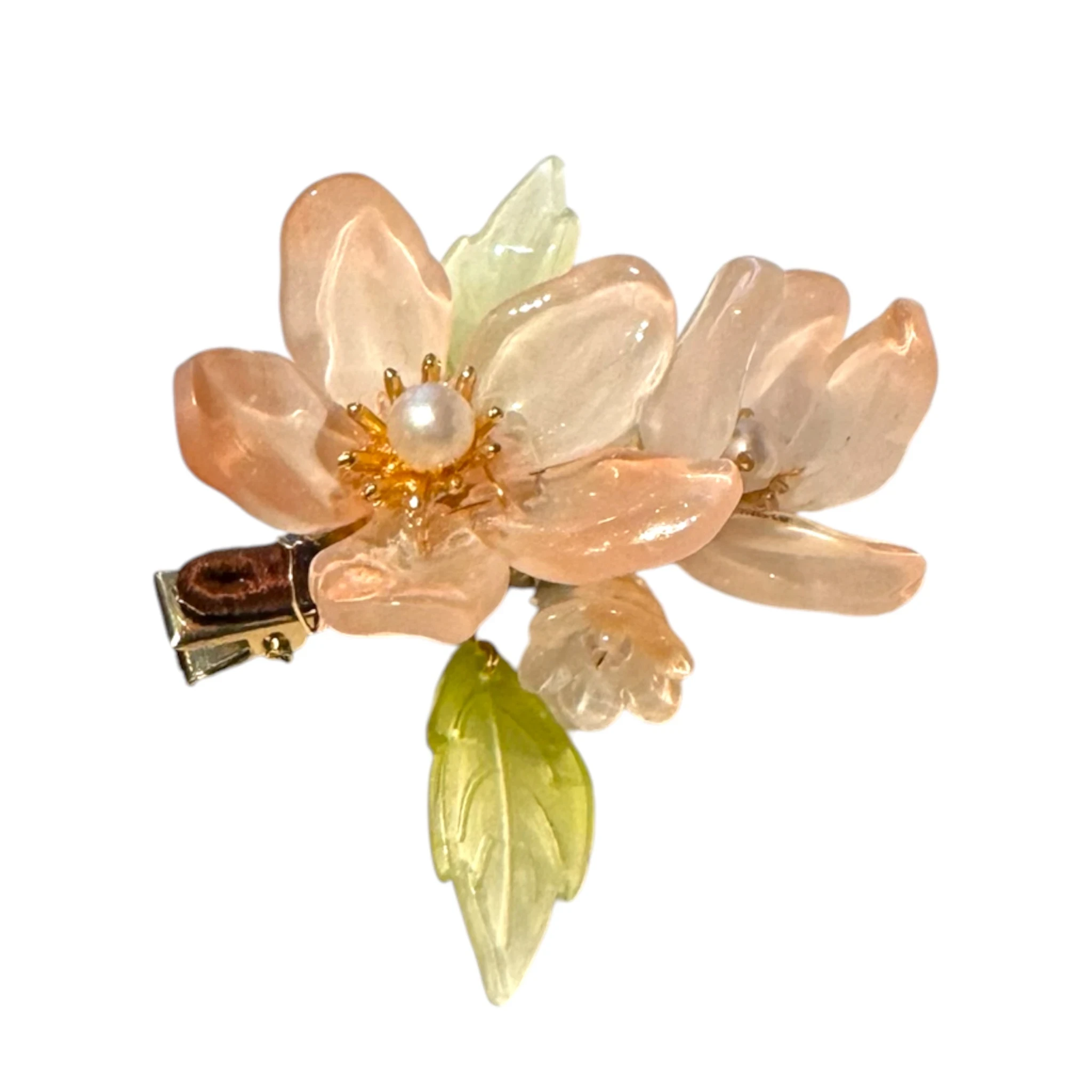 Apportez une touche de raffinement à votre coiffure avec cette pince à cheveux japonaise ornée d’une grande fleur rose pâle en verre, d’une petite fleur assortie et de pétales verdâtres en verre. Ses détails dorés, ses strass et sa pince en métal doré lui donnent un style lumineux et élégant, parfait pour sublimer un chignon, une demi-queue ou une coiffure de cérémonie.