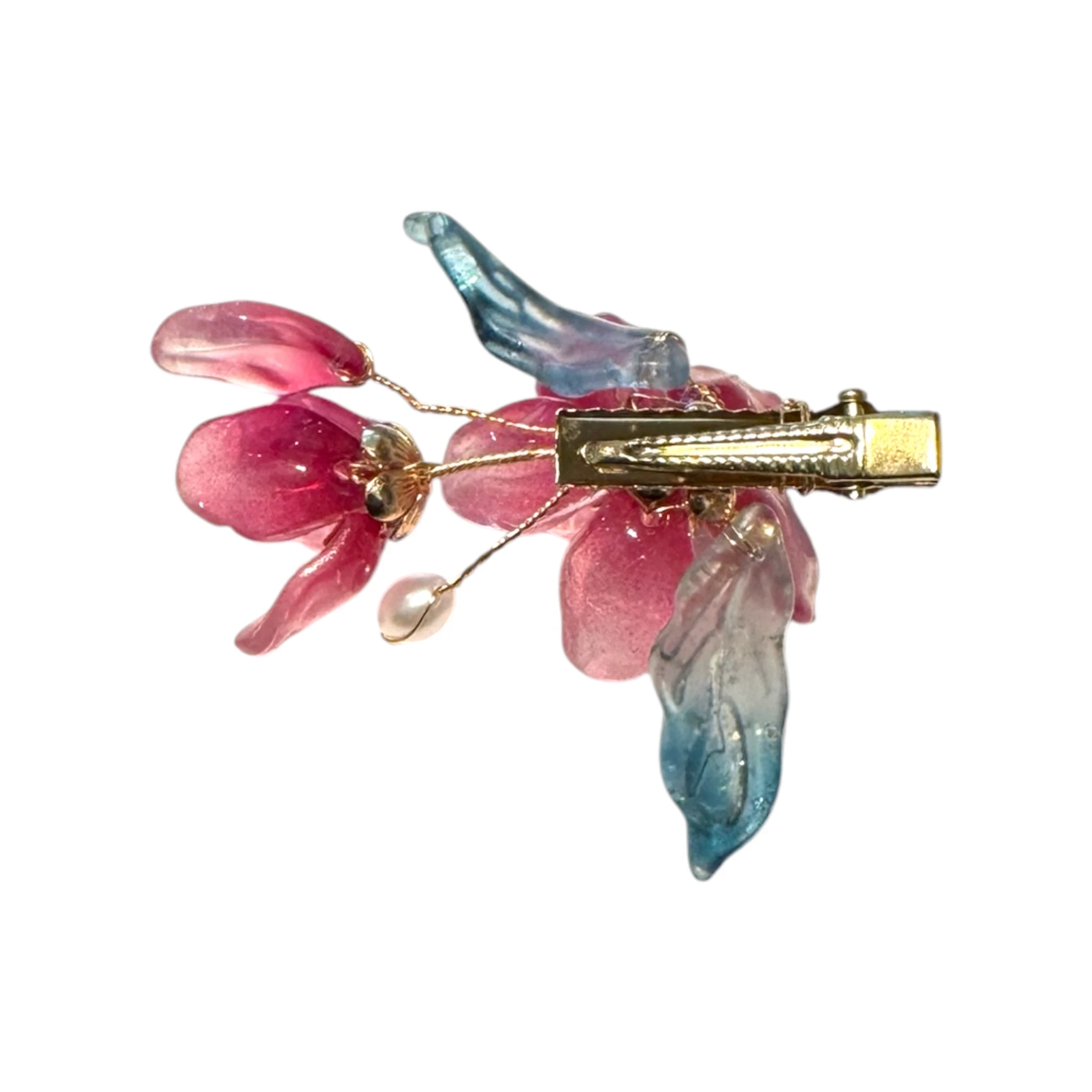 Elle associe une grande fleur rose mauve en verre, une petite fleur rose et verte en verre, de jolis pétales bleus, des détails dorés et un ajout de strass pour une finition élégante.