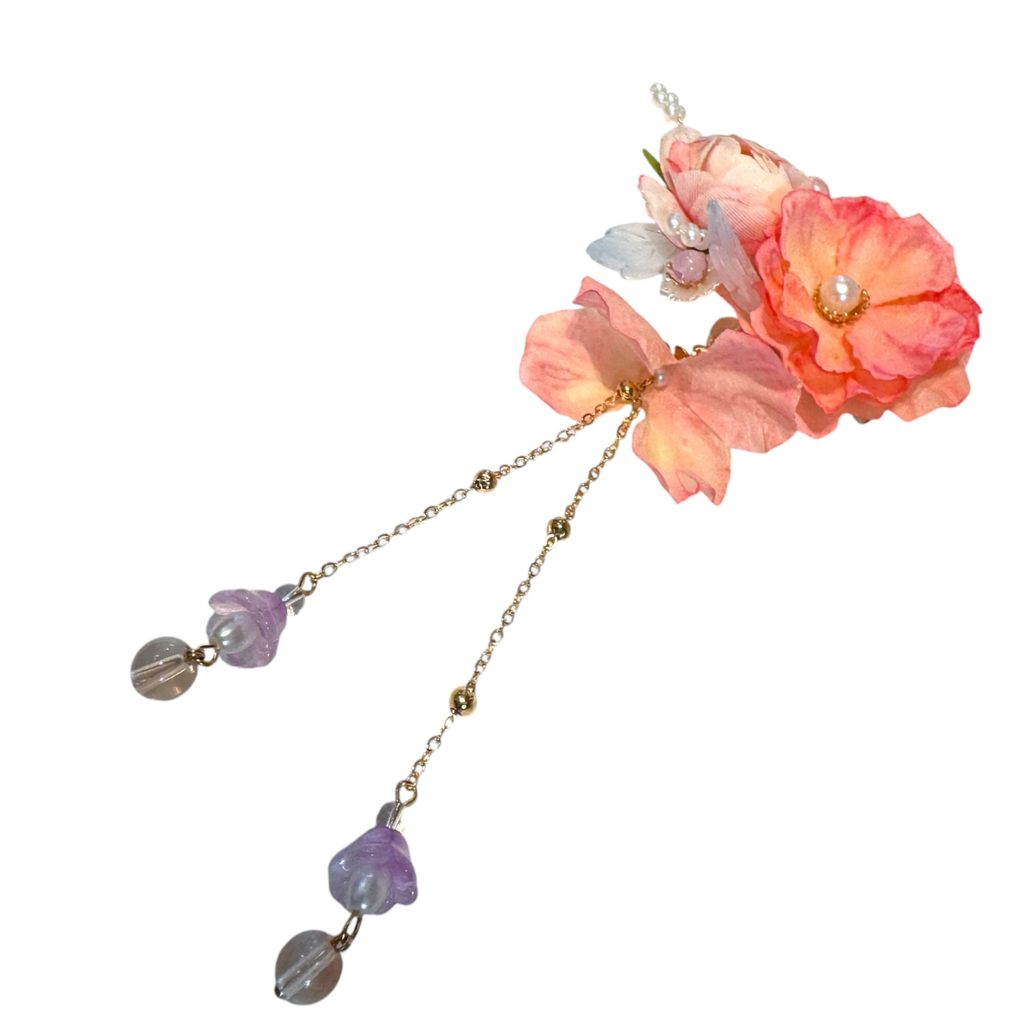 Cette pince à cheveux japonaise séduit par son style poétique et élégant. Elle associe deux grandes fleurs rose pâle en tissu, l’une ouverte et l’autre fermée, à de jolis pétales bleus en verre, de petites fleurs mauves et de fins pendants floraux qui apportent du mouvement et beaucoup de charme à la coiffure.