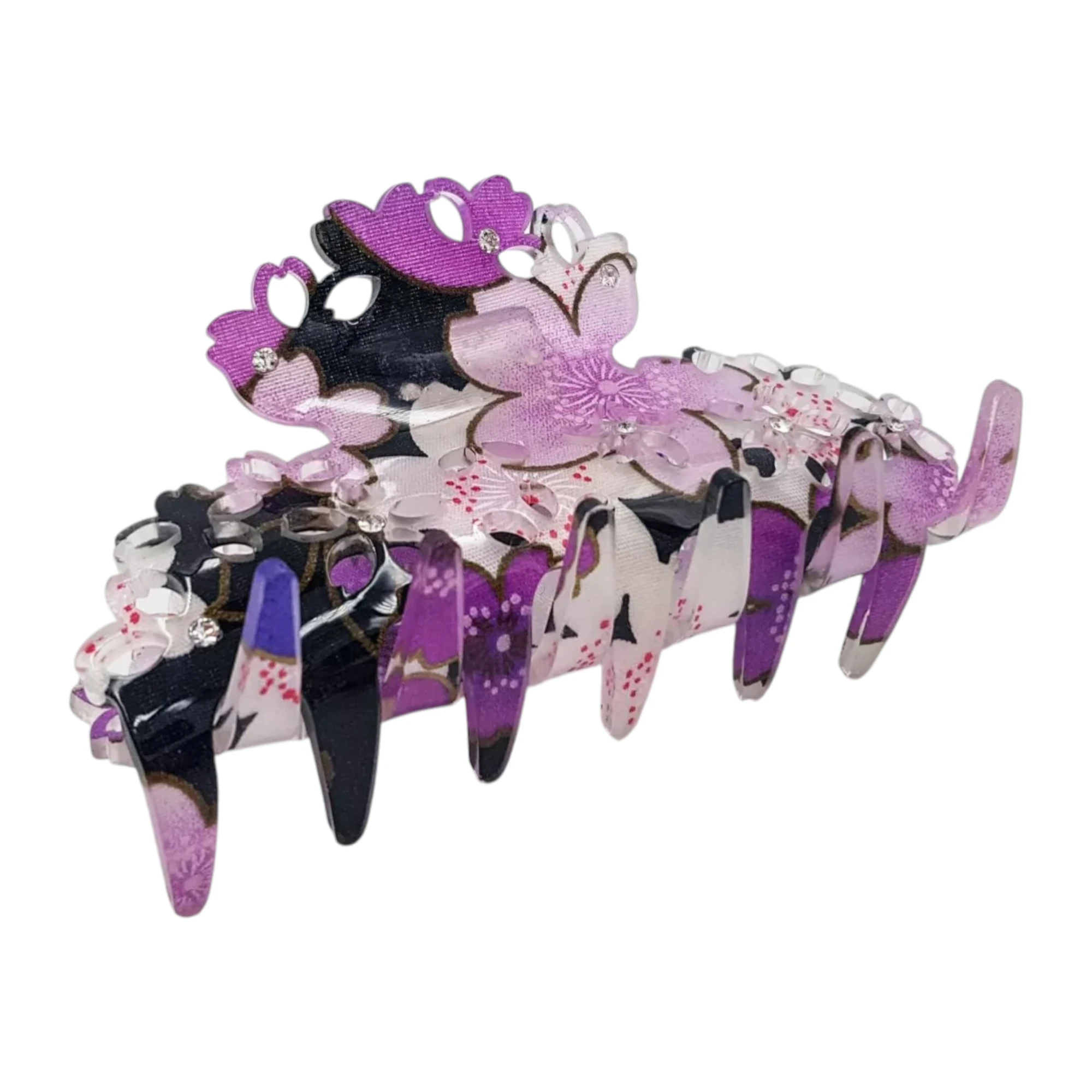 Réalisée en tissu chirimen japonais cristallisé dans la résine, elle séduit par ses couleurs lumineuses, ses détails floraux et son allure délicate.