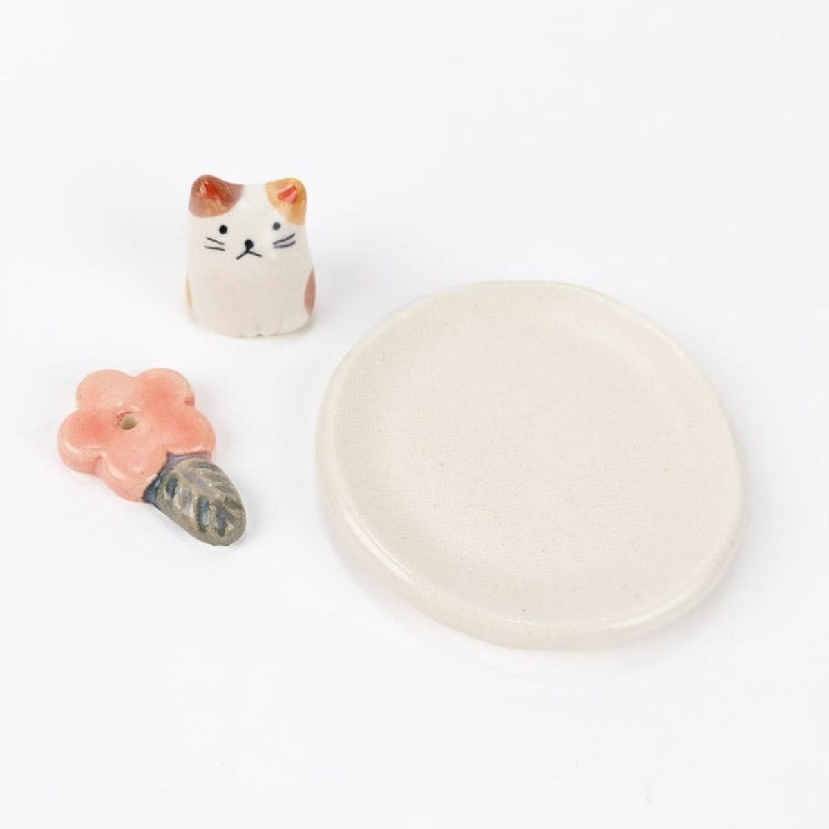 Ce porte-encens japonais Kobana Neko est une véritable œuvre artisanale, fabriquée à la main dans la cité céramiste de Seto au Japon. Il se compose de trois éléments : un socle délicatement façonné, un chat Calico Neko assis paisiblement, et une fleur de cerisier (Sakura), symbole de beauté éphémère.