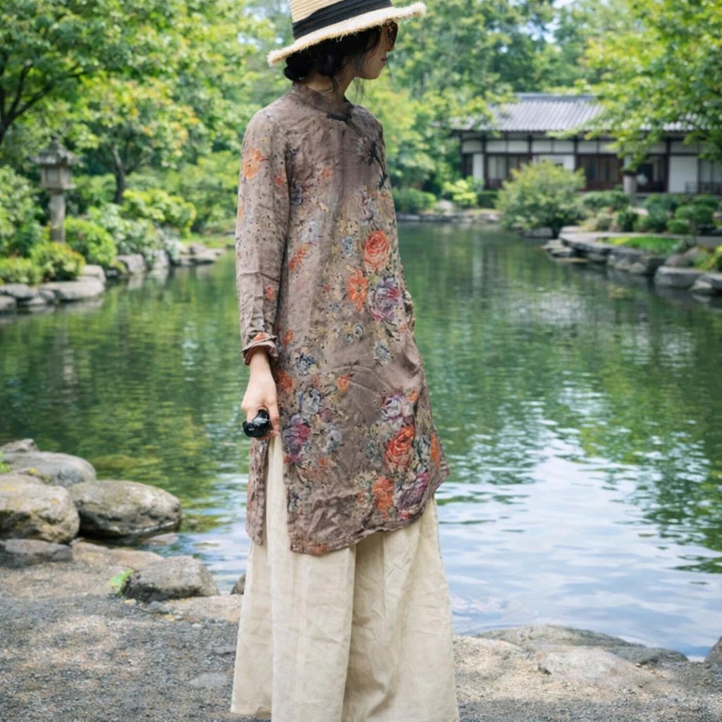 Cette robe asiatique mi-longue en 100% coton séduit par son style naturel et raffiné. Son coloris beige à motifs floraux apporte une touche douce et zen, idéale pour le printemps et l’été.