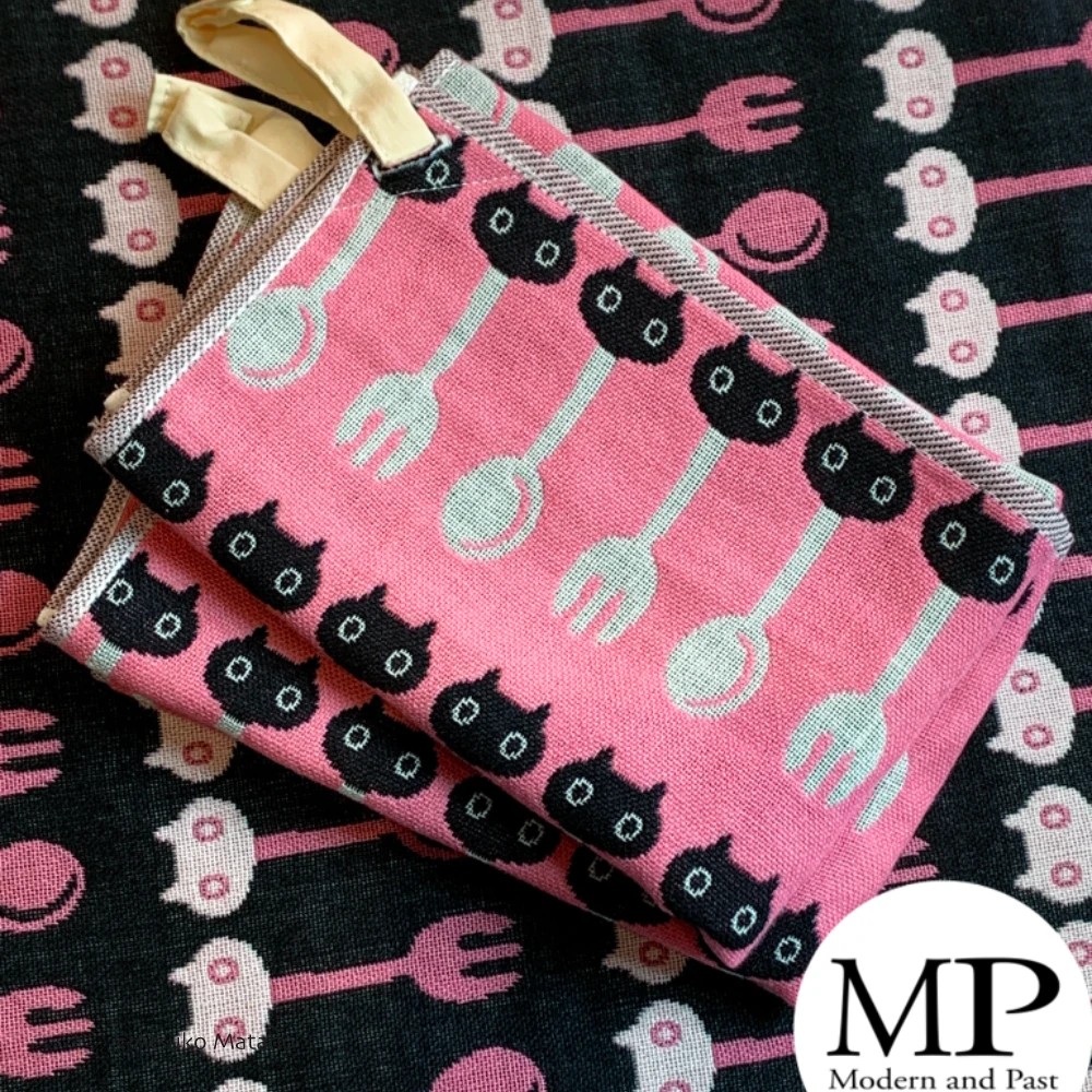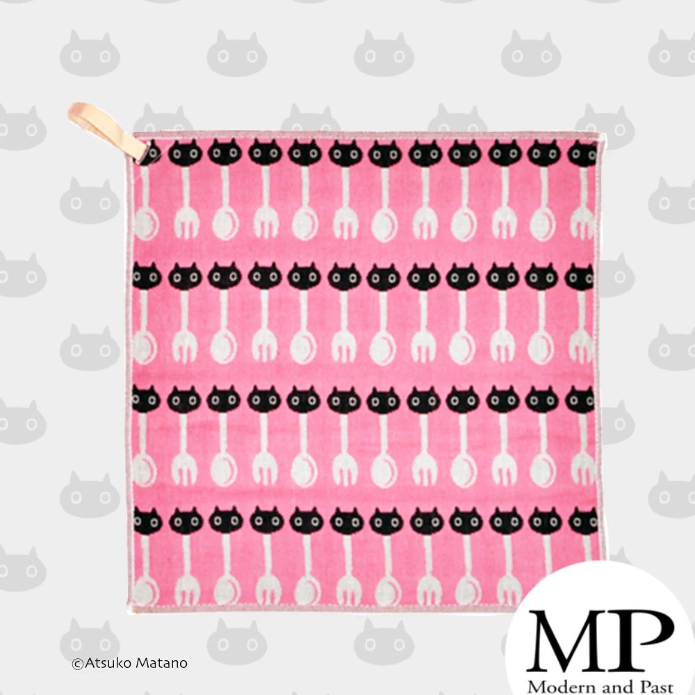 Cette serviette japonaise en gaze de coton rose signée Atsuko Matano présente un adorable motif de chats perchés sur des cuillères et des fourchettes.