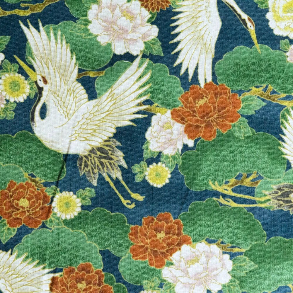 Ce tissu en coton japonais se distingue par son motif raffiné de grues en plein vol et de fleurs traditionnelles, symbole d’harmonie et de beauté. Le fond bleu profond met en valeur les dorures et les couleurs florales, apportant une touche authentique à toutes vos créations textiles.