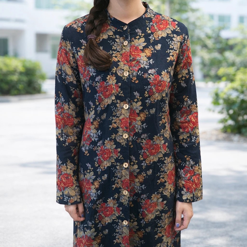 Cette veste japonaise longue séduit par son imprimé floral rouge et jaune délicatement posé sur un fond bleu profond. Confectionnée en coton 100 % naturel, elle offre un tombé fluide et agréable, idéal pour un usage quotidien.
