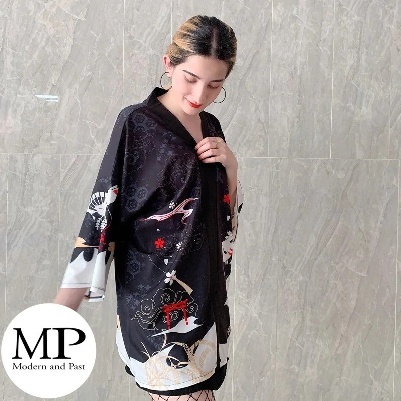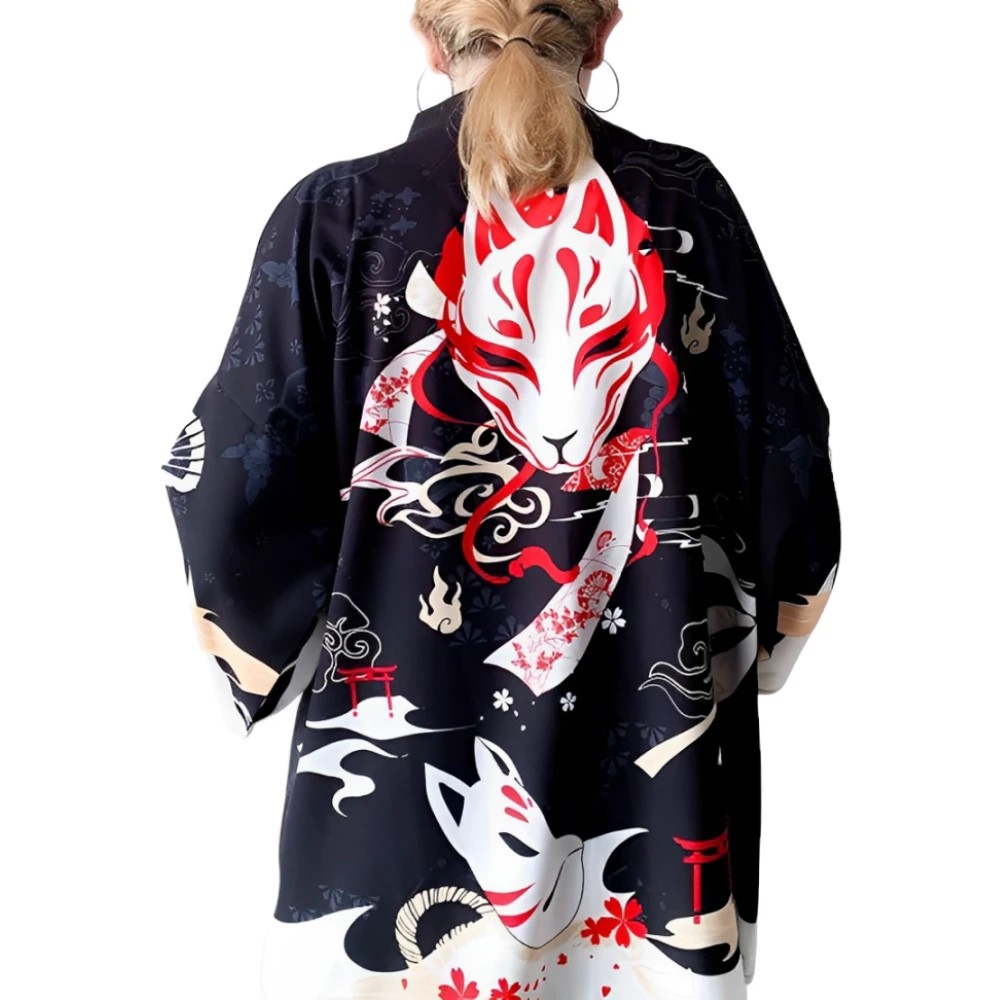 Cette veste kimono moderne Oji Kitsune s’inspire de la street fashion japonaise, mêlant symboles traditionnels et design contemporain. Sur le dos, un renard Kitsune émergent d’un décor mystérieux composé de torii et de volutes inspirées des légendes japonaises.